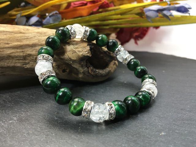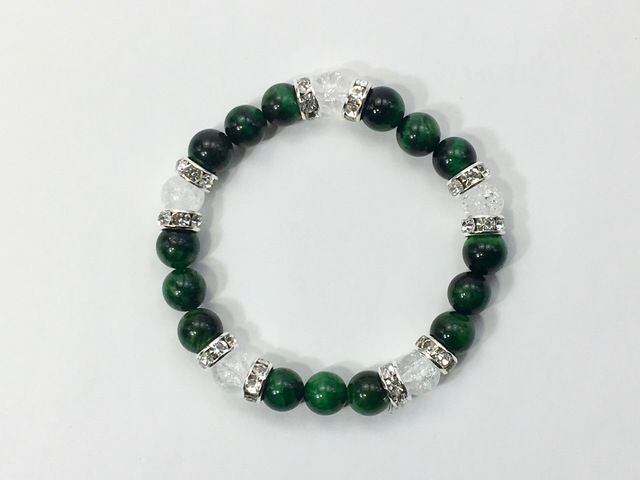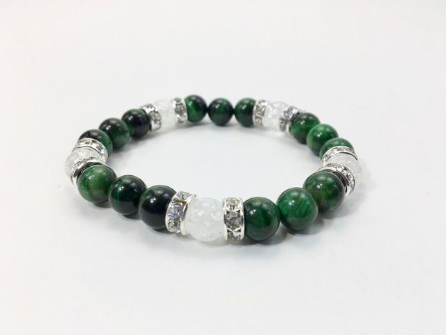 こちらは、8mm玉のグリーンタイガーアイとクラック水晶を使ったパワーストーンブレスレットです。シンプルなデザインでどんなコーディネートにも合わせやすいデザインに仕上げています。サイズは内周約15cmです。気になる方は是非この機会にどうぞ。