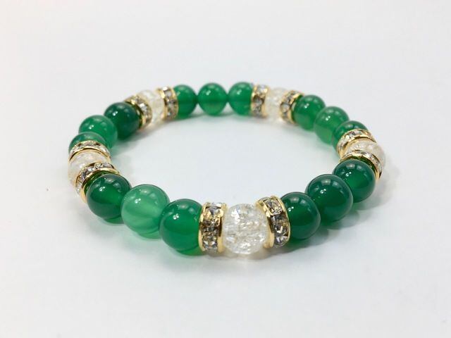 こちらは、8mm玉の緑瑪瑙とクラック水晶を使ったパワーストーンブレスレットです。シンプルなデザインでどんなコーディネートにも合わせやすいデザインに仕上げています。サイズは内周約15cmです。気になる方は是非この機会にどうぞ。