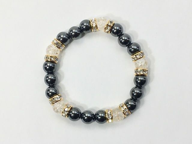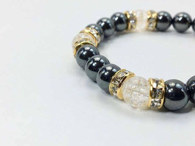 こちらは、8mm玉のヘマタイトとクラック水晶を使ったパワーストーンブレスレットです。シンプルなデザインでどんなコーディネートにも合わせやすいデザインに仕上げています。サイズは内周約15cmです。気になる方は是非この機会にどうぞ。