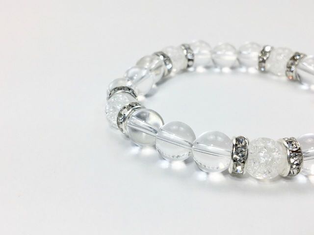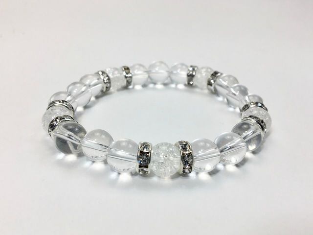 こちらは、8mm玉の水晶とクラック水晶を使ったパワーストーンブレスレットです。シンプルなデザインでどんなコーディネートにも合わせやすいデザインに仕上げています。サイズは内周約15cmです。気になる方は是非この機会にどうぞ。