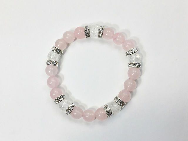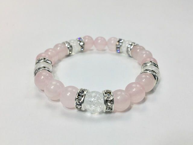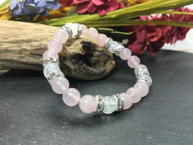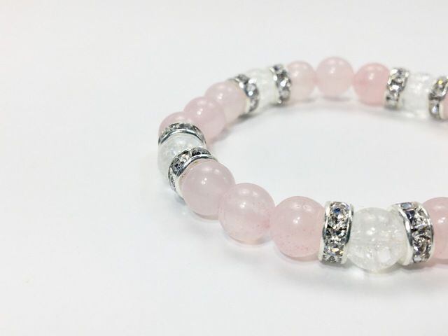 こちらは、8mm玉のローズクォーツとクラック水晶を使ったパワーストーンブレスレットです。シンプルなデザインでどんなコーディネートにも合わせやすいデザインに仕上げています。サイズは内周約15cmです。気になる方は是非この機会にどうぞ。