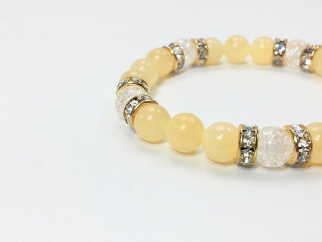 こちらは、8mm玉のハウライトとクラック水晶を使ったパワーストーンブレスレットです。シンプルなデザインでどんなコーディネートにも合わせやすいデザインに仕上げています。サイズは内周約15cmです。気になる方は是非この機会にどうぞ。