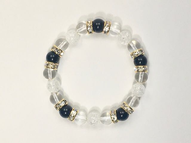 こちらは、8mm玉のオニキスと水晶、クラック水晶を組み合わせたパワーストーンブレスレットです。今回は五芒星デザインで石を配置しております。五芒星とは、陰陽道の基本概念となった陰陽五行説、木・火・土・金・水の5つの元素の働きの相克を表したものであり、五芒星は厄除・開運を願うデザインと重宝されているデザインです。サイズは内周約15cmです。気になる方は是非この機会にどうぞ。