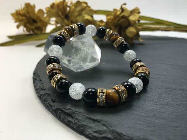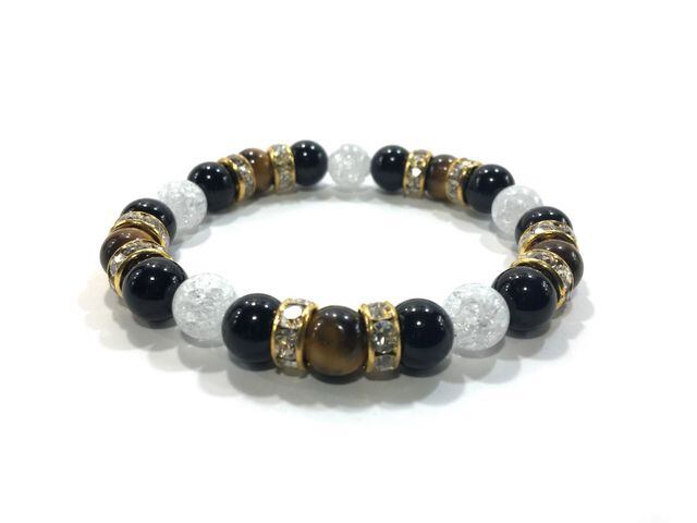 パワーストーン ブレスレット タイガーアイ&オニキス&クラック水晶 天然石 (ゴールド)レディース 女性 数珠ブレス 開運 プレゼント ギフト