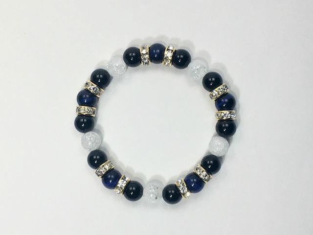 こちらは、8mm玉のブルータイガーアイとオニキス、クラック水晶を組み合わせたパワーストーンブレスレットです。今回は五芒星デザインで石を配置しております。五芒星とは、陰陽道の基本概念となった陰陽五行説、木・火・土・金・水の5つの元素の働きの相克を表したものであり、五芒星は厄除・開運を願うデザインと重宝されているデザインです。サイズは内周約15cmです。気になる方は是非この機会にどうぞ。