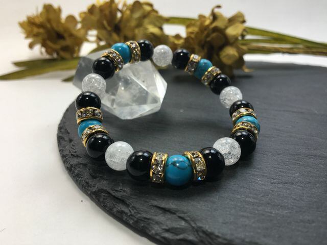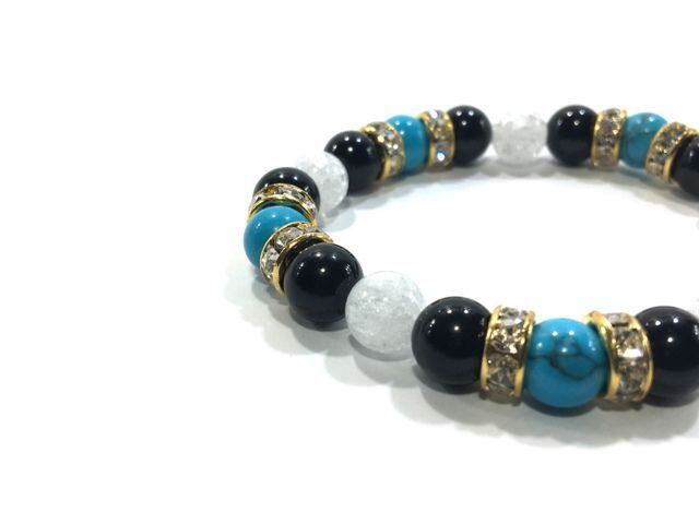 パワーストーン ブレスレット ターコイズ&オニキス&クラック水晶 天然石 (ゴールド)レディース 女性 数珠ブレス 開運 プレゼント ギフト