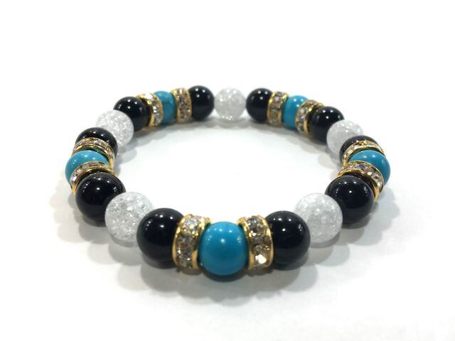 こちらは、8mm玉のターコイズとオニキス、クラック水晶を組み合わせたパワーストーンブレスレットです。今回は五芒星デザインで石を配置しております。五芒星とは、陰陽道の基本概念となった陰陽五行説、木・火・土・金・水の5つの元素の働きの相克を表したものであり、五芒星は厄除・開運を願うデザインと重宝されているデザインです。サイズは内周約15cmです。気になる方は是非この機会にどうぞ。