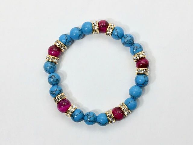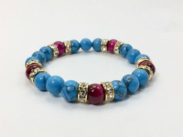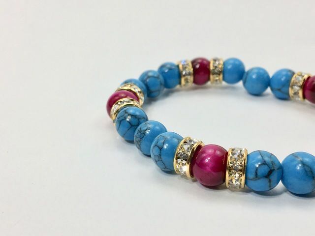 こちらは、8mm玉のターコイズとピンクタイガーアイを使ったパワーストーンブレスレットです。シンプルなデザインでどんなコーディネートにも合わせやすいデザインに仕上げています。サイズは内径約15cmです。気になる方は是非この機会にどうぞ。