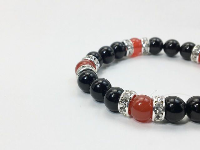 こちらは、8mm玉のオニキスと赤瑪瑙を使ったパワーストーンブレスレットです。シンプルなデザインでどんなコーディネートにも合わせやすいデザインに仕上げています。サイズは内周約15cmです。気になる方は是非この機会にどうぞ。