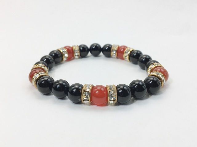こちらは、8mm玉のオニキスと赤瑪瑙を使ったパワーストーンブレスレットです。シンプルなデザインでどんなコーディネートにも合わせやすいデザインに仕上げています。サイズは内周約15cmです。気になる方は是非この機会にどうぞ。
