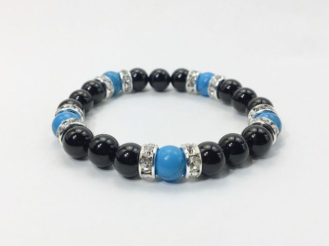 こちらは、8mm玉のオニキスとターコイズを使ったパワーストーンブレスレットです。シンプルなデザインでどんなコーディネートにも合わせやすいデザインに仕上げています。サイズは内周約15cmです。気になる方は是非この機会にどうぞ。