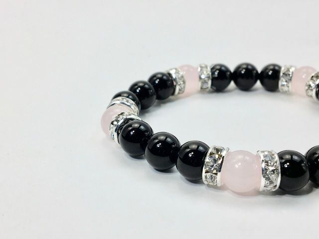 こちらは、8mm玉のオニキスとローズクォーツを使ったパワーストーンブレスレットです。シンプルなデザインでどんなコーディネートにも合わせやすいデザインに仕上げています。サイズは内周約15cmです。気になる方は是非この機会にどうぞ。