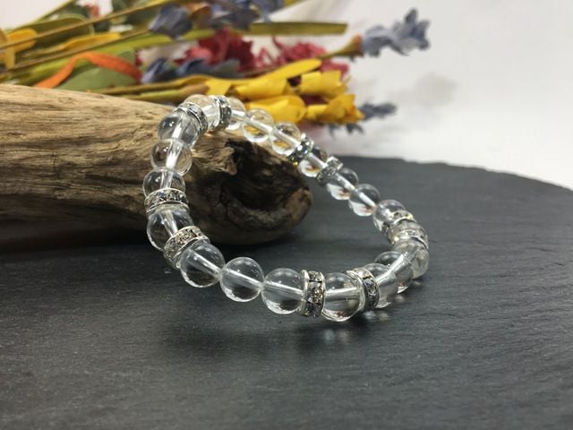 こちらは、8mm玉の水晶を使ったパワーストーンブレスレットです。シンプルなデザインでどんなコーディネートにも合わせやすいデザインに仕上げています。サイズは内周約15cmです。気になる方は是非この機会にどうぞ。
