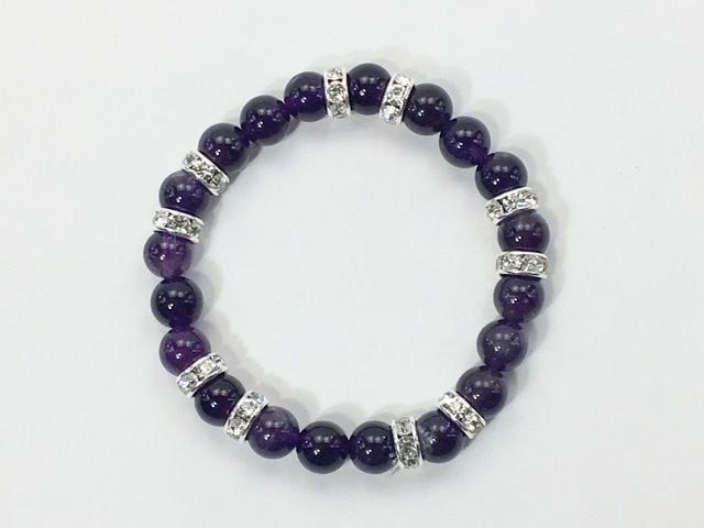 こちらは、8mm玉のアメジストを使ったパワーストーンブレスレットです。シンプルなデザインでどんなコーディネートにも合わせやすいデザインに仕上げています。サイズは内周約15cmです。気になる方は是非この機会にどうぞ。