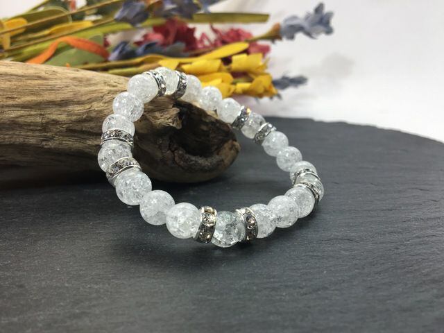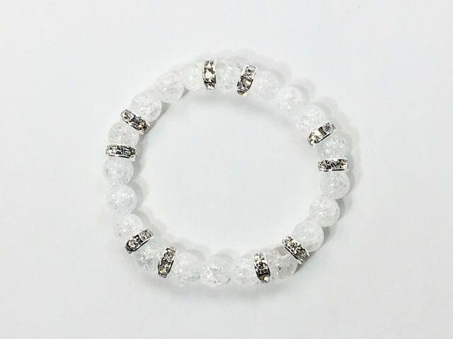 こちらは、8mm玉のクラック水晶を使ったパワーストーンブレスレットです。シンプルなデザインでどんなコーディネートにも合わせやすいデザインに仕上げています。サイズは内周約15cmです。気になる方は是非この機会にどうぞ。