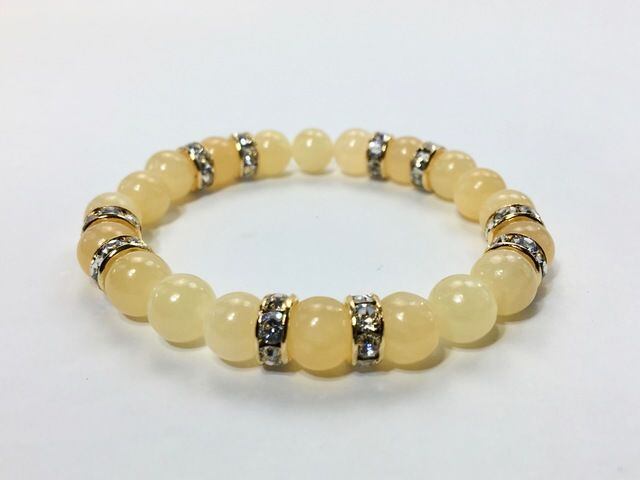 こちらは、8mm玉のアラゴナイトを使ったパワーストーンブレスレットです。シンプルなデザインでどんなコーディネートにも合わせやすいデザインに仕上げています。サイズは内周約15cmです。気になる方は是非この機会にどうぞ。
