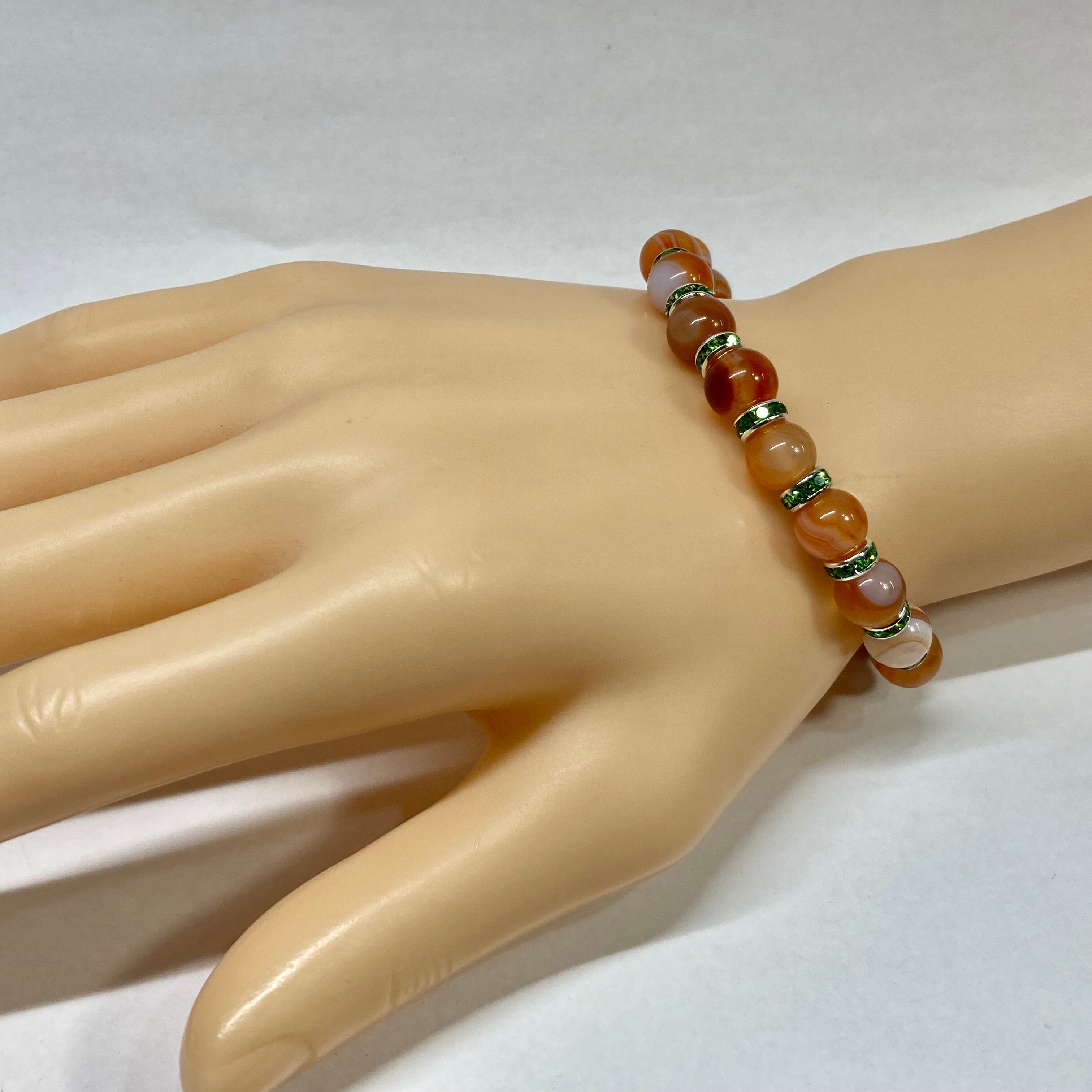 こちらは、カーネリアン・サードニクスの8mm玉を使用したパワーストーンブレスレットです。石との間にはロンデルを挟み高級感を演出しております。シンプルなデザインは、シーン問わずどんなコーディネートとも合わせ易いブレスレットです。サイズは内周約15cm (手首周りを測り少し余裕をもってお買い求めくださいませ。)です。当社の中でも一番人気の実績があるデザインとなっております。気になる方はお早めにどうぞ。