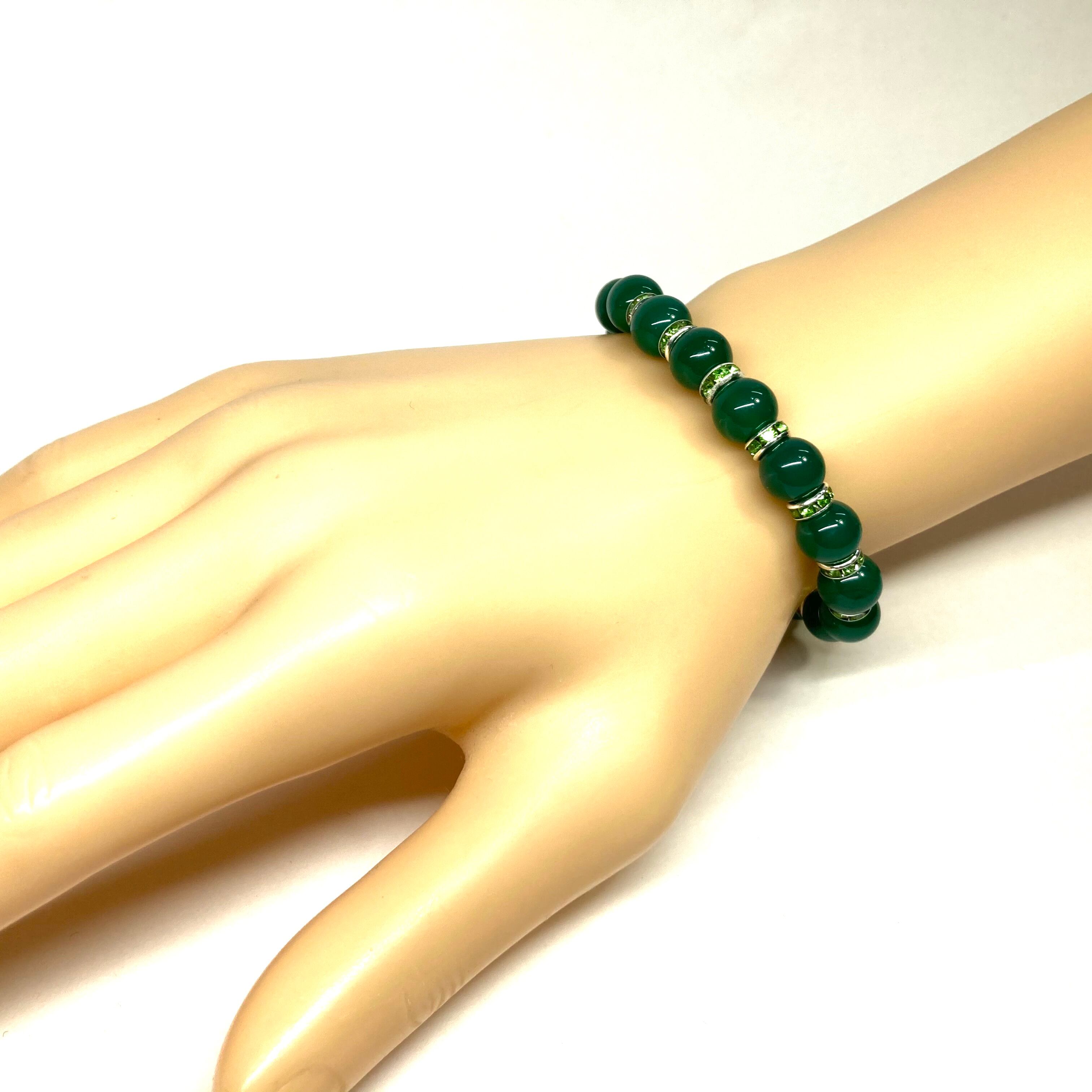 こちらは、緑瑪瑙の8mm玉を使用したパワーストーンブレスレットです。石との間にはロンデルを挟み高級感を演出しております。シンプルなデザインは、シーン問わずどんなコーディネートとも合わせ易いブレスレットです。サイズは内周約15cm (手首周りを測り少し余裕をもってお買い求めくださいませ。)です。当社の中でも一番人気の実績があるデザインとなっております。気になる方はお早めにどうぞ。