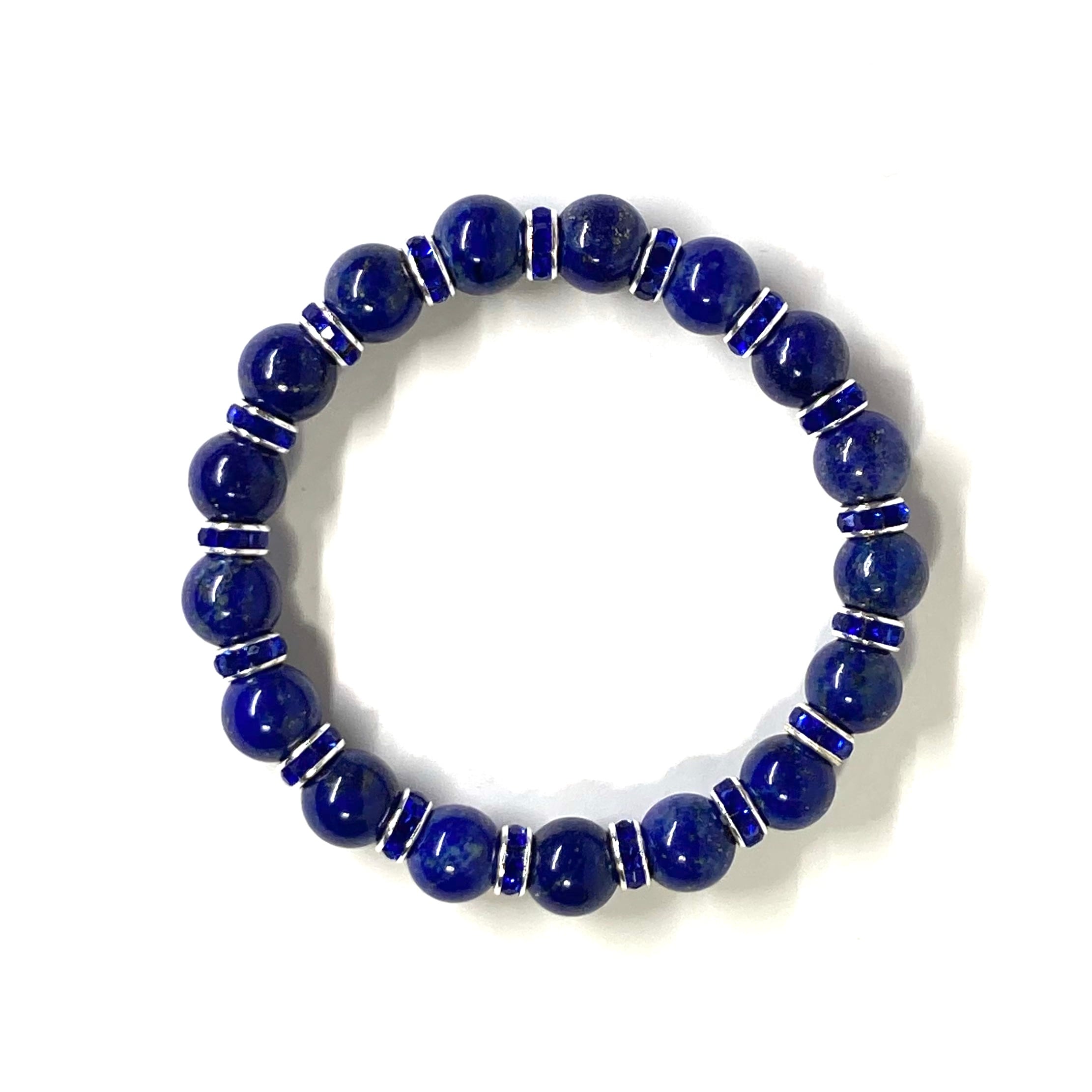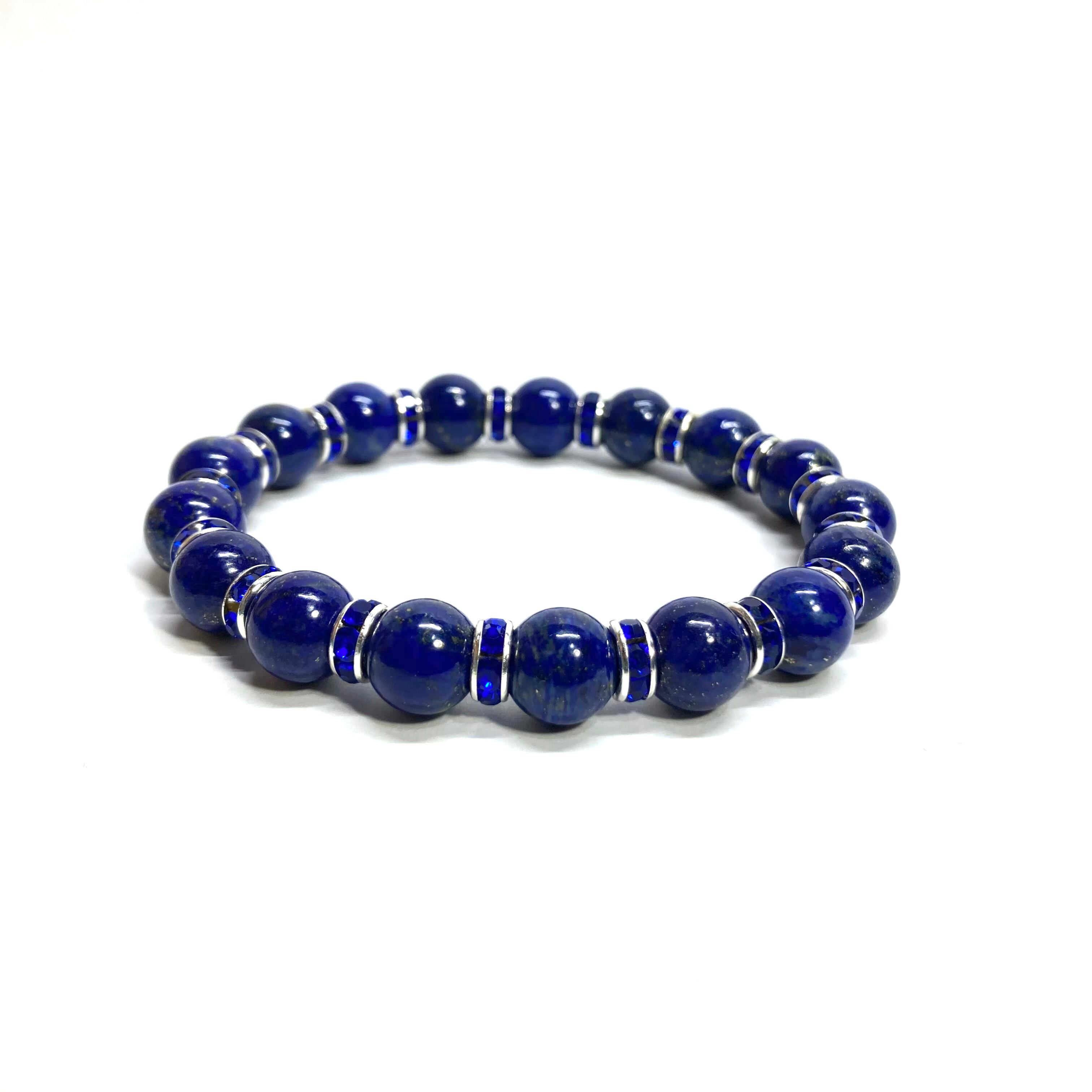 こちらは、ラピスラズリの8mm玉を使用したパワーストーンブレスレットです。石との間にはロンデルを挟み高級感を演出しております。シンプルなデザインは、シーン問わずどんなコーディネートとも合わせ易いブレスレットです。サイズは内周約15cm (手首周りを測り少し余裕をもってお買い求めくださいませ。)です。当社の中でも一番人気の実績があるデザインとなっております。気になる方はお早めにどうぞ。