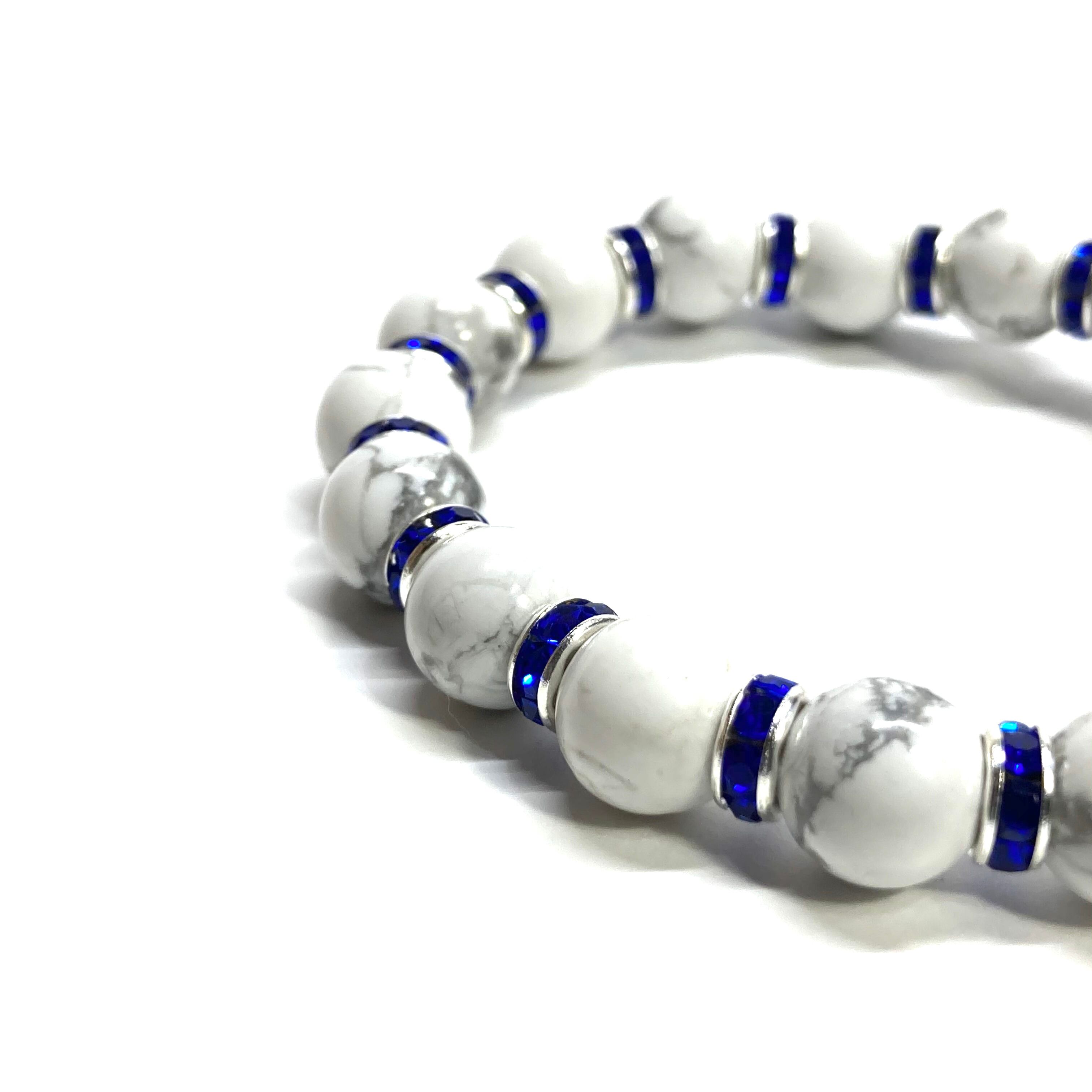 こちらは、ハウライトの8mm玉を使用したパワーストーンブレスレットです。石との間にはロンデルを挟み高級感を演出しております。シンプルなデザインは、シーン問わずどんなコーディネートとも合わせ易いブレスレットです。サイズは内周約15cm (手首周りを測り少し余裕をもってお買い求めくださいませ。)です。当社の中でも一番人気の実績があるデザインとなっております。気になる方はお早めにどうぞ。