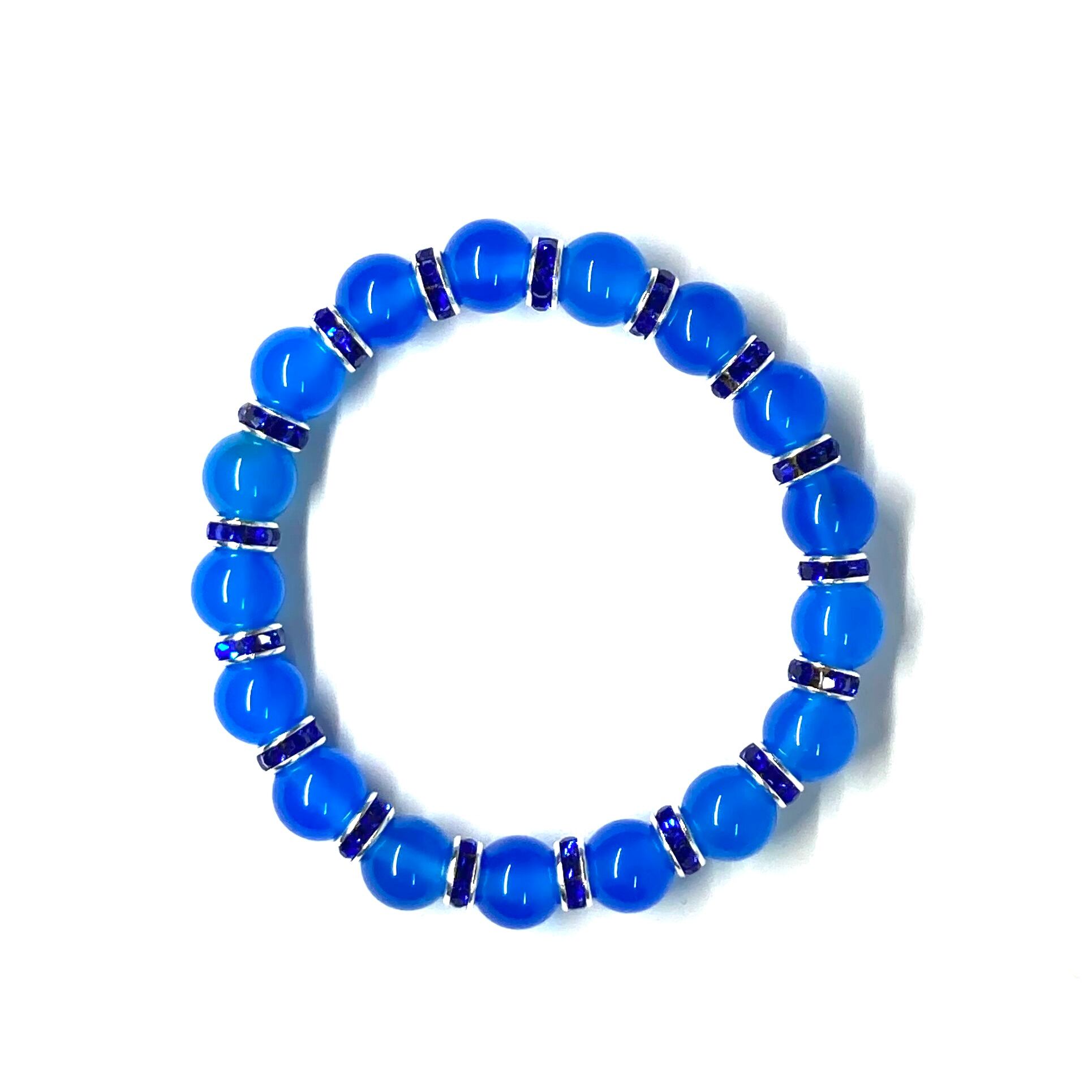 こちらは、ブルーメノウの8mm玉を使用したパワーストーンブレスレットです。石との間にはロンデルを挟み高級感を演出しております。シンプルなデザインは、シーン問わずどんなコーディネートとも合わせ易いブレスレットです。サイズは内周約15cm (手首周りを測り少し余裕をもってお買い求めくださいませ。)です。当社の中でも一番人気の実績があるデザインとなっております。気になる方はお早めにどうぞ。