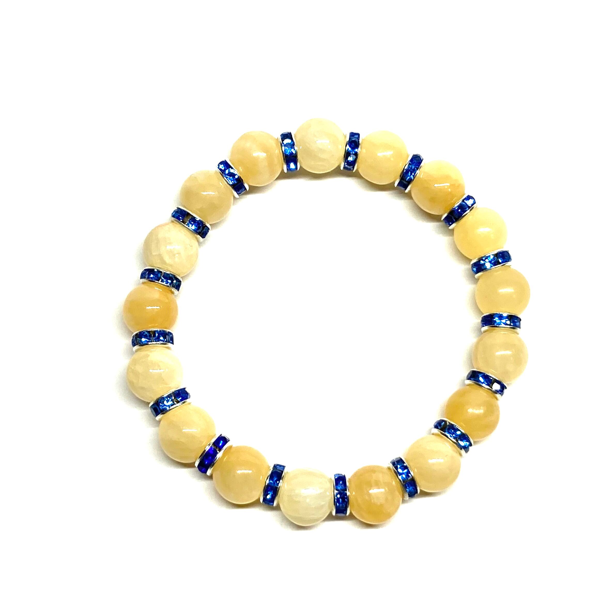 こちらは、アラゴナイトの8mm玉を使用したパワーストーンブレスレットです。石との間にはロンデルを挟み高級感を演出しております。シンプルなデザインは、シーン問わずどんなコーディネートとも合わせ易いブレスレットです。サイズは内周約15cm (手首周りを測り少し余裕をもってお買い求めくださいませ。)です。当社の中でも一番人気の実績があるデザインとなっております。気になる方はお早めにどうぞ。