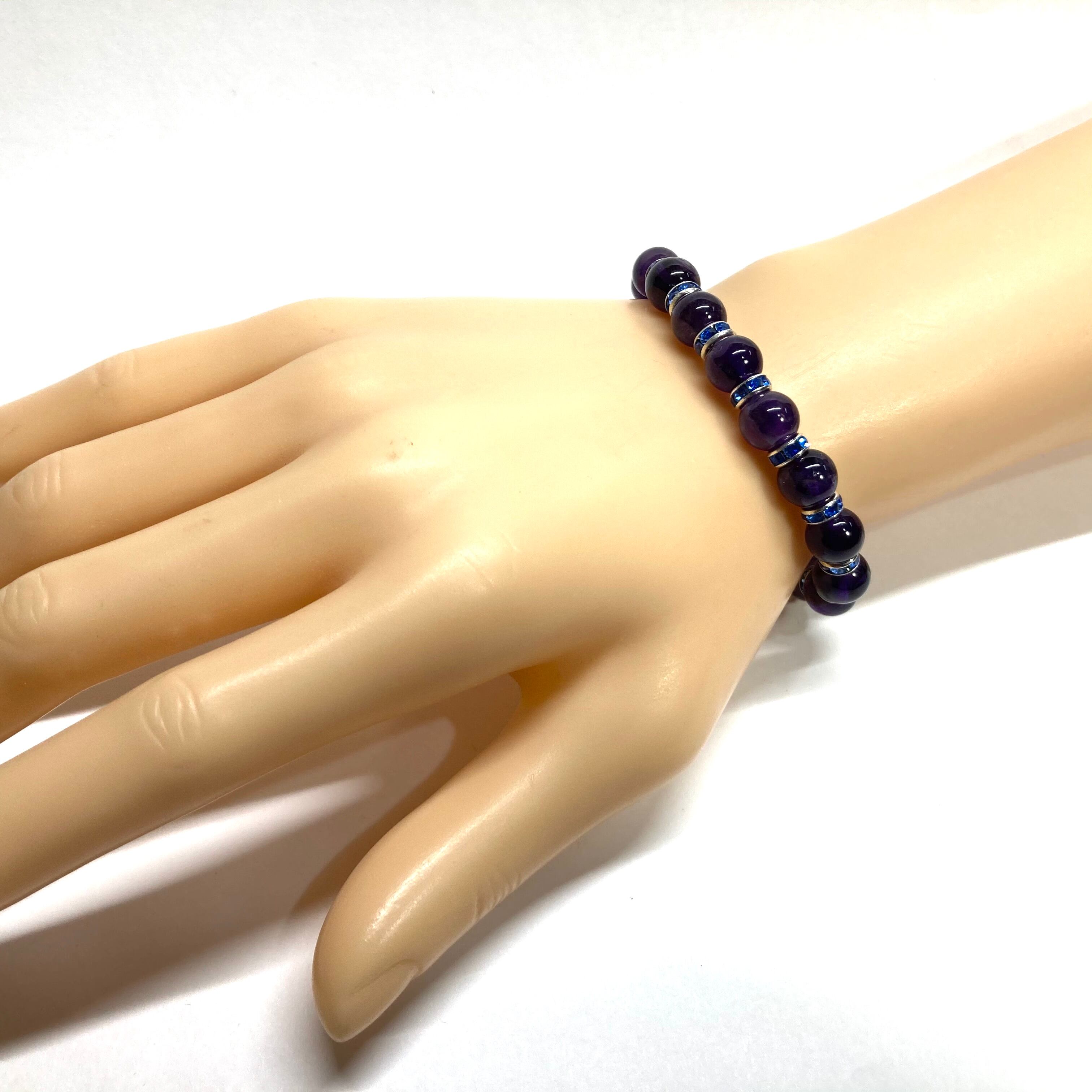 こちらは、アメジストの8mm玉を使用したパワーストーンブレスレットです。石との間にはロンデルを挟み高級感を演出しております。シンプルなデザインは、シーン問わずどんなコーディネートとも合わせ易いブレスレットです。サイズは内周約15cm (手首周りを測り少し余裕をもってお買い求めくださいませ。)です。当社の中でも一番人気の実績があるデザインとなっております。気になる方はお早めにどうぞ。