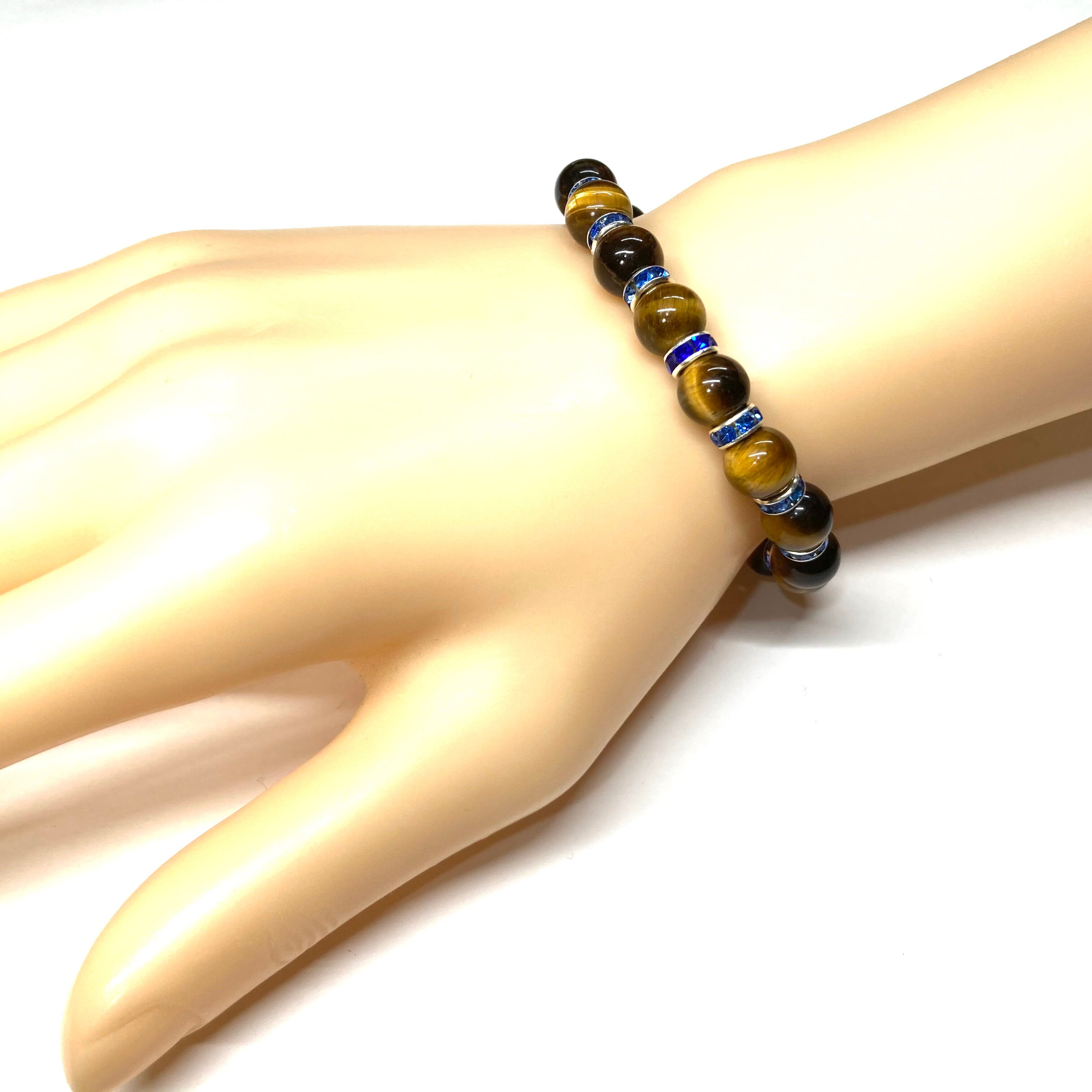 こちらは、タイガーアイの8mm玉を使用したパワーストーンブレスレットです。石との間にはロンデルを挟み高級感を演出しております。シンプルなデザインは、シーン問わずどんなコーディネートとも合わせ易いブレスレットです。サイズは内周約15cm (手首周りを測り少し余裕をもってお買い求めくださいませ。)です。当社の中でも一番人気の実績があるデザインとなっております。気になる方はお早めにどうぞ。