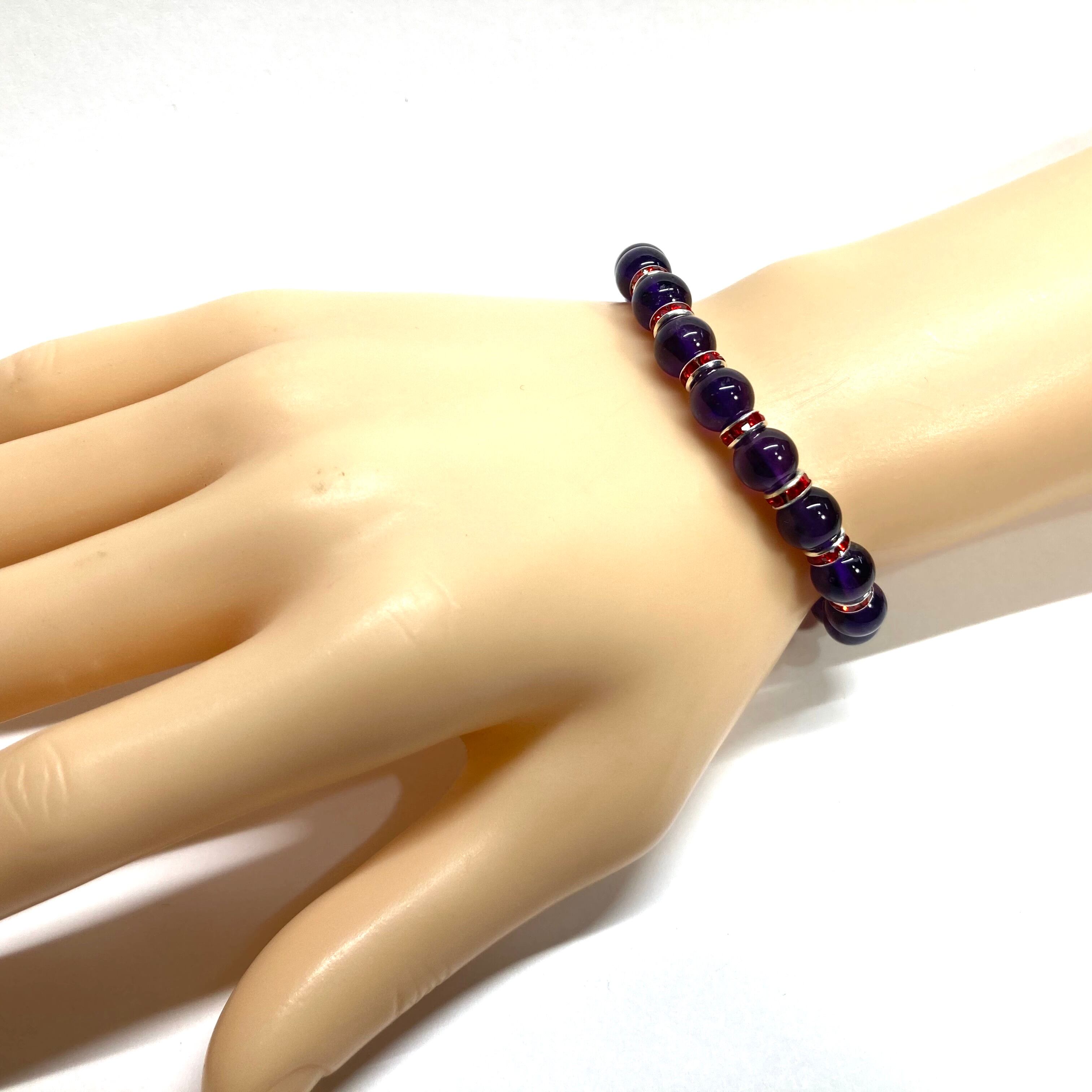 こちらは、アメジストの8mm玉を使用したパワーストーンブレスレットです。石との間にはロンデルを挟み高級感を演出しております。シンプルなデザインは、シーン問わずどんなコーディネートとも合わせ易いブレスレットです。サイズは内周約15cm (手首周りを測り少し余裕をもってお買い求めくださいませ。)です。当社の中でも一番人気の実績があるデザインとなっております。気になる方はお早めにどうぞ。