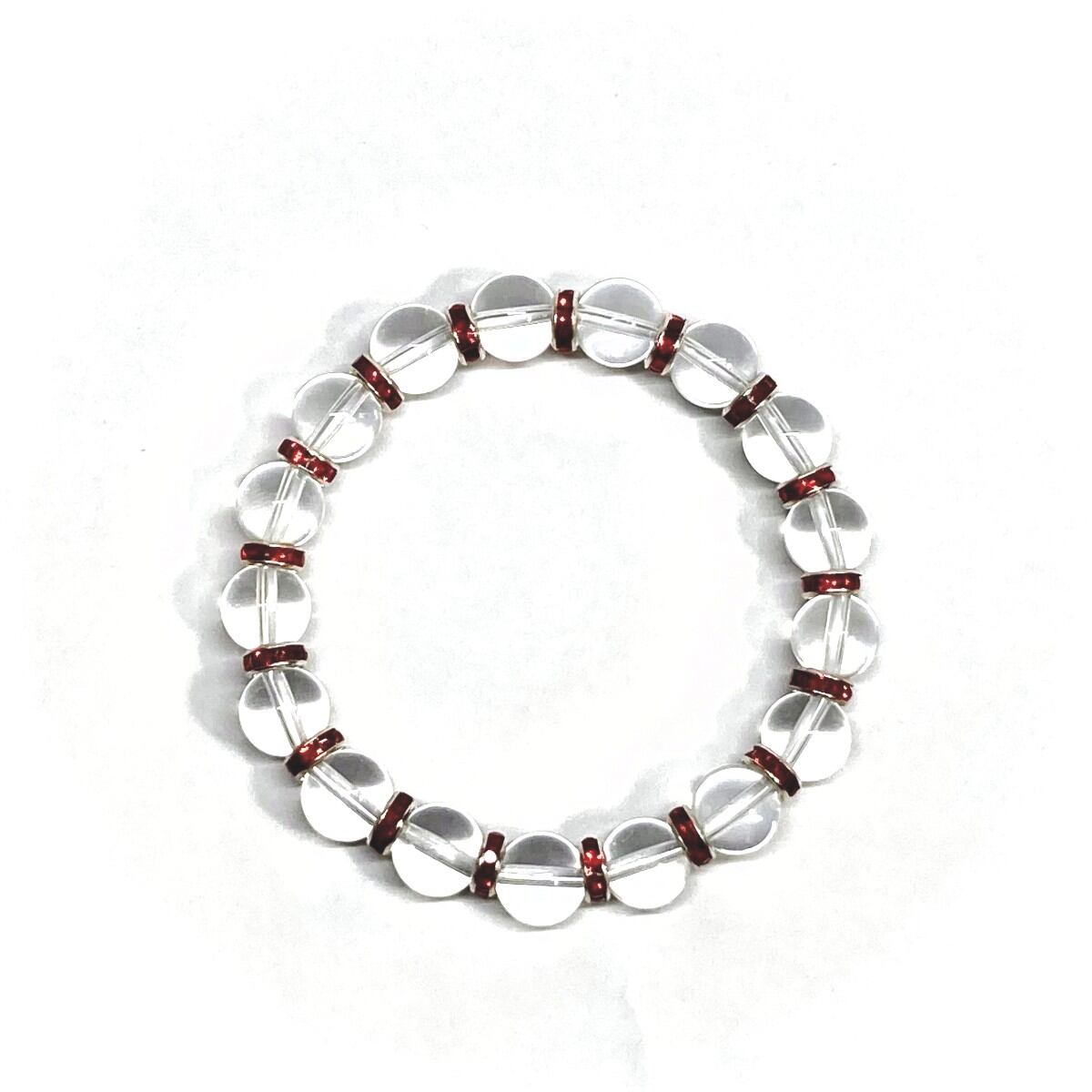 こちらは、水晶の8mm玉を使用したパワーストーンブレスレットです。石との間にはロンデルを挟み高級感を演出しております。シンプルなデザインは、シーン問わずどんなコーディネートとも合わせ易いブレスレットです。サイズは内周約15cm (手首周りを測り少し余裕をもってお買い求めくださいませ。)です。当社の中でも一番人気の実績があるデザインとなっております。気になる方はお早めにどうぞ。