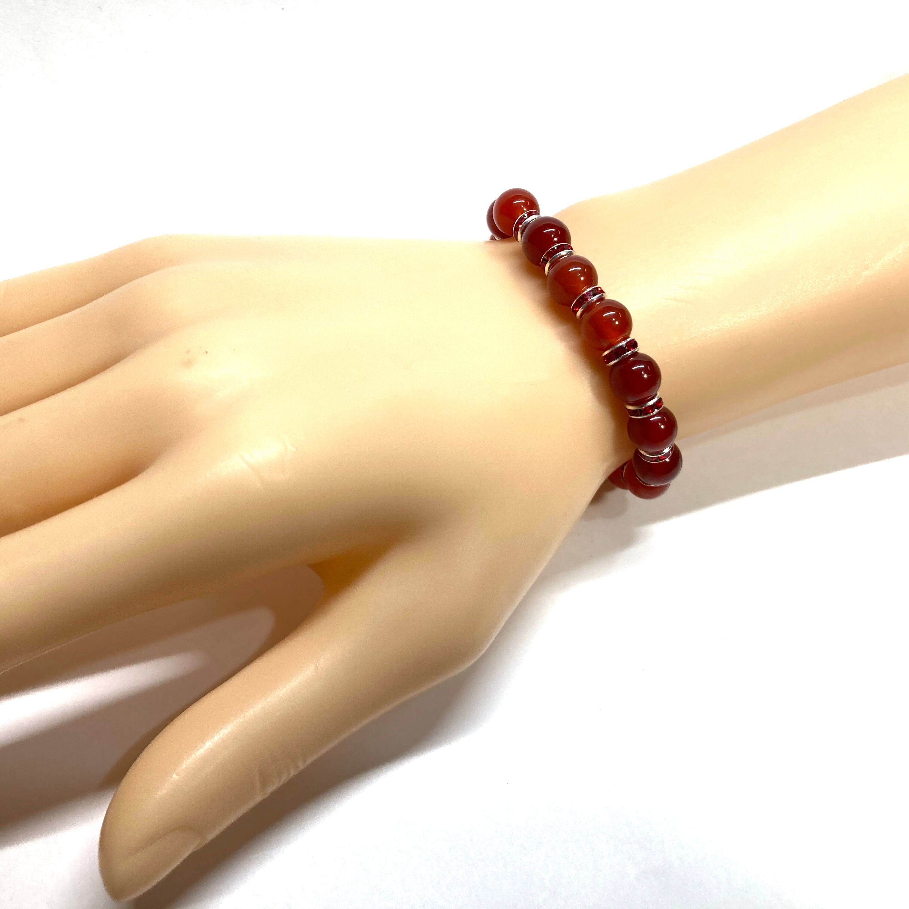 こちらは、赤瑪瑙の8mm玉を使用したパワーストーンブレスレットです。石との間にはロンデルを挟み高級感を演出しております。シンプルなデザインは、シーン問わずどんなコーディネートとも合わせ易いブレスレットです。サイズは内周約15cm (手首周りを測り少し余裕をもってお買い求めくださいませ。)です。当社の中でも一番人気の実績があるデザインとなっております。気になる方はお早めにどうぞ。