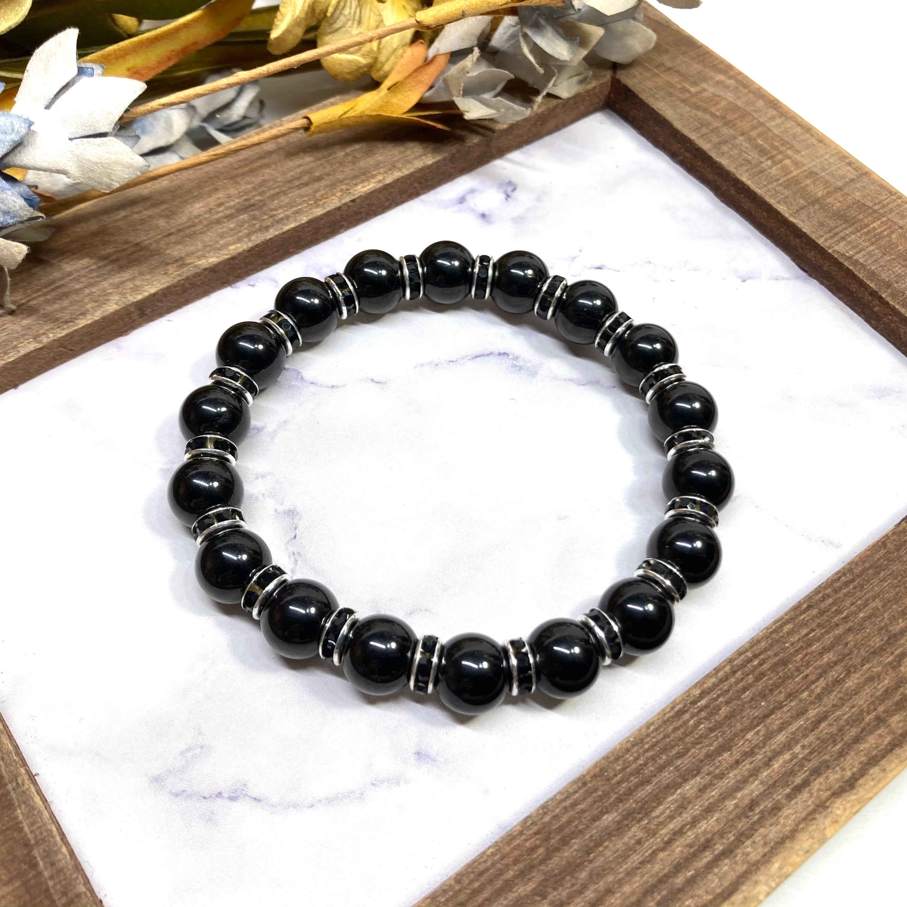 こちらは、ブラックスピネルの8mm玉を使用したパワーストーンブレスレットです。石との間にはロンデルを挟み高級感を演出しております。シンプルなデザインは、シーン問わずどんなコーディネートとも合わせ易いブレスレットです。サイズは内周約15cm (手首周りを測り少し余裕をもってお買い求めくださいませ。)です。当社の中でも一番人気の実績があるデザインとなっております。気になる方はお早めにどうぞ。