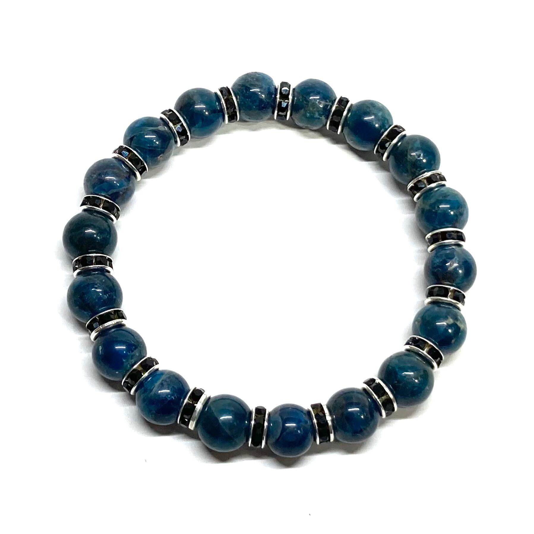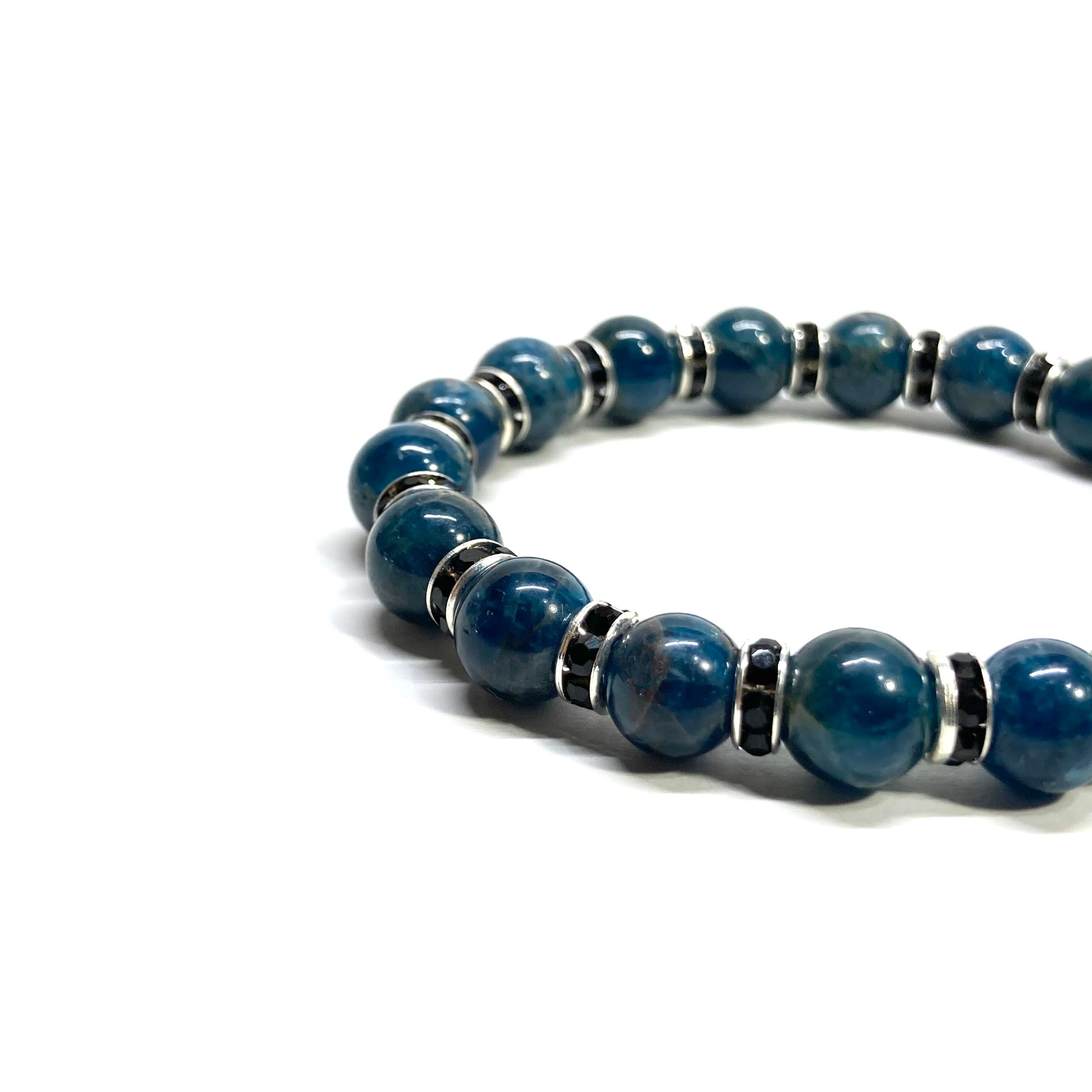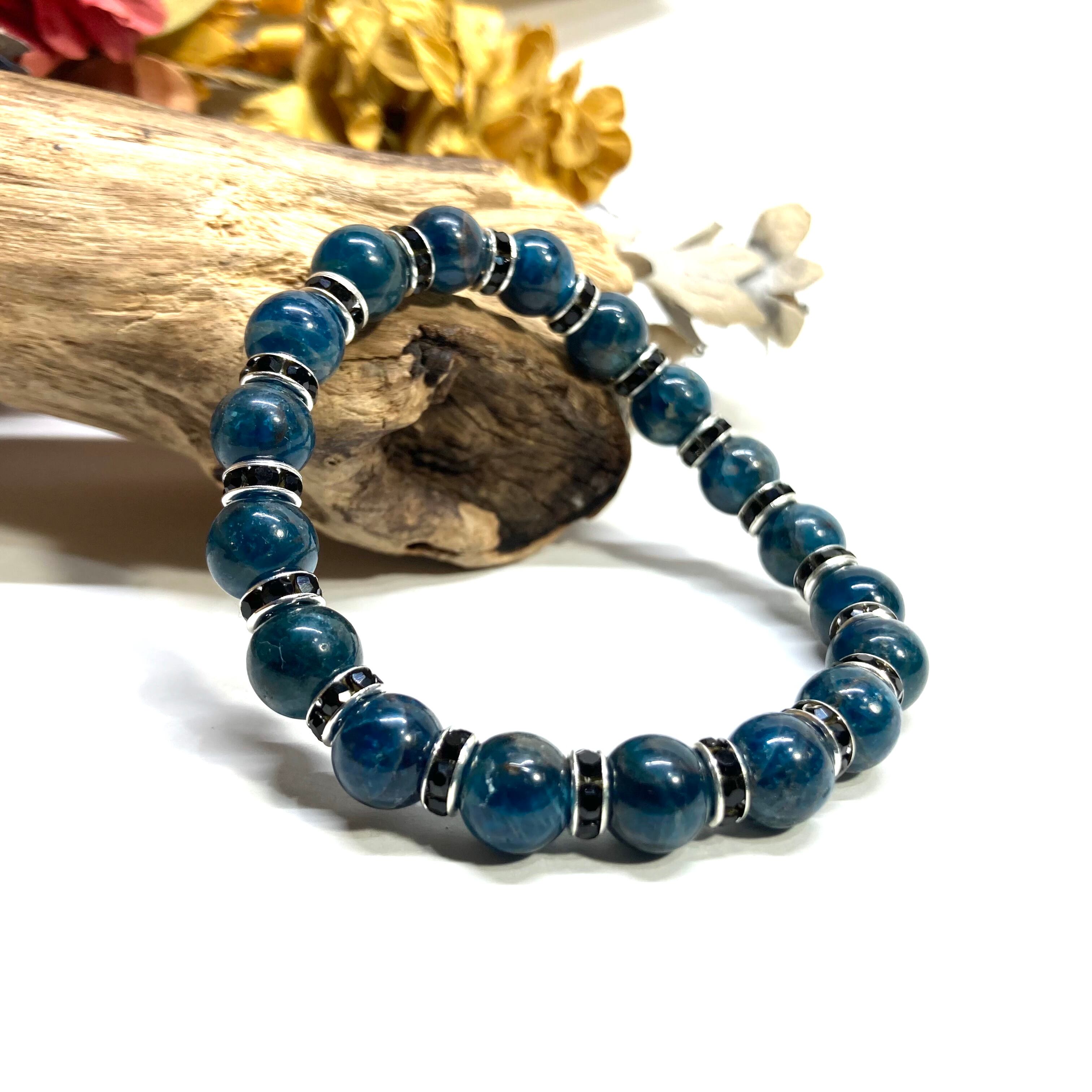 こちらは、アパタイトの8mm玉を使用したパワーストーンブレスレットです。石との間にはロンデルを挟み高級感を演出しております。シンプルなデザインは、シーン問わずどんなコーディネートとも合わせ易いブレスレットです。サイズは内周約15cm (手首周りを測り少し余裕をもってお買い求めくださいませ。)です。当社の中でも一番人気の実績があるデザインとなっております。気になる方はお早めにどうぞ。