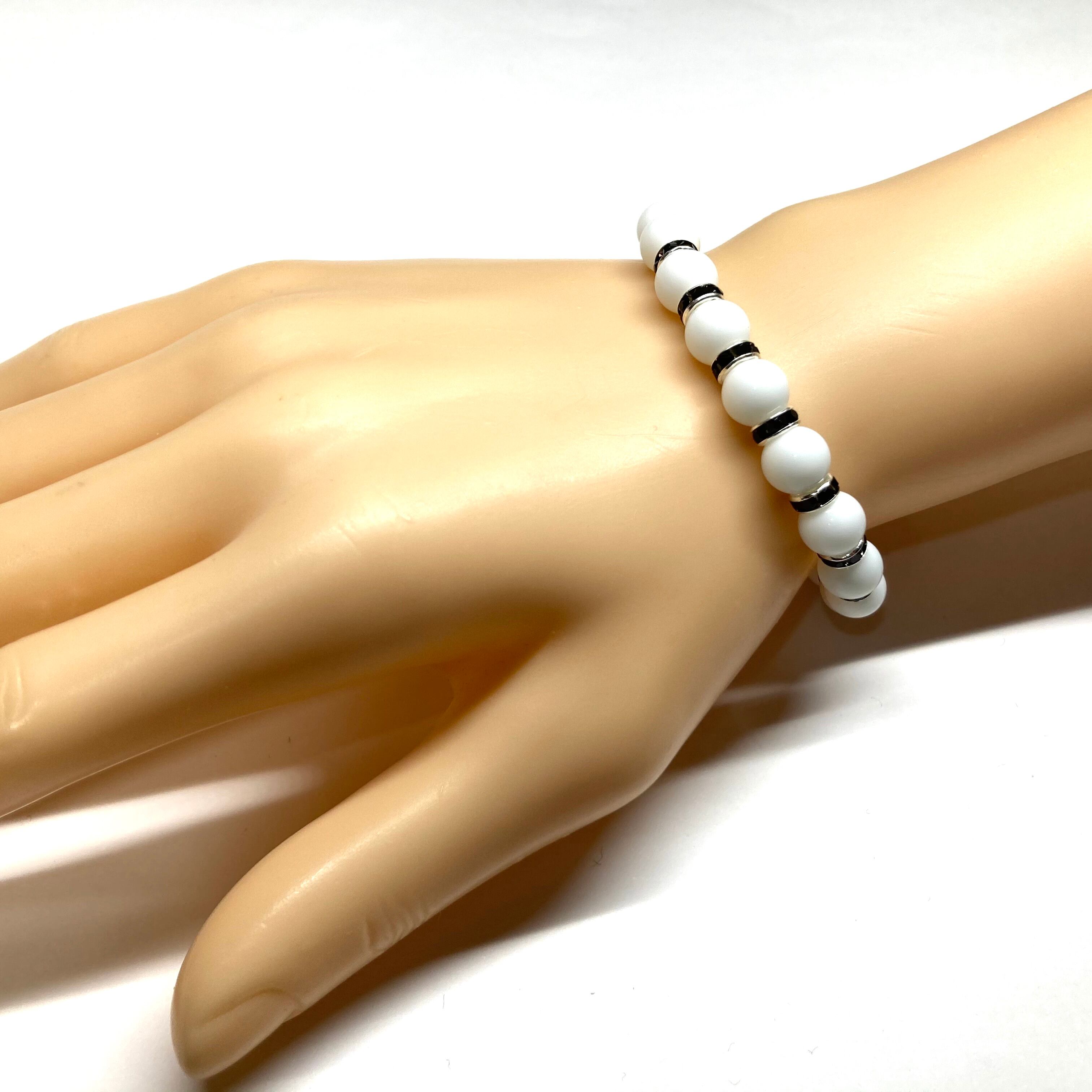 こちらは、ホワイトオニキスの8mm玉を使用したパワーストーンブレスレットです。石との間にはロンデルを挟み高級感を演出しております。シンプルなデザインは、シーン問わずどんなコーディネートとも合わせ易いブレスレットです。サイズは内周約15cm (手首周りを測り少し余裕をもってお買い求めくださいませ。)です。当社の中でも一番人気の実績があるデザインとなっております。気になる方はお早めにどうぞ。