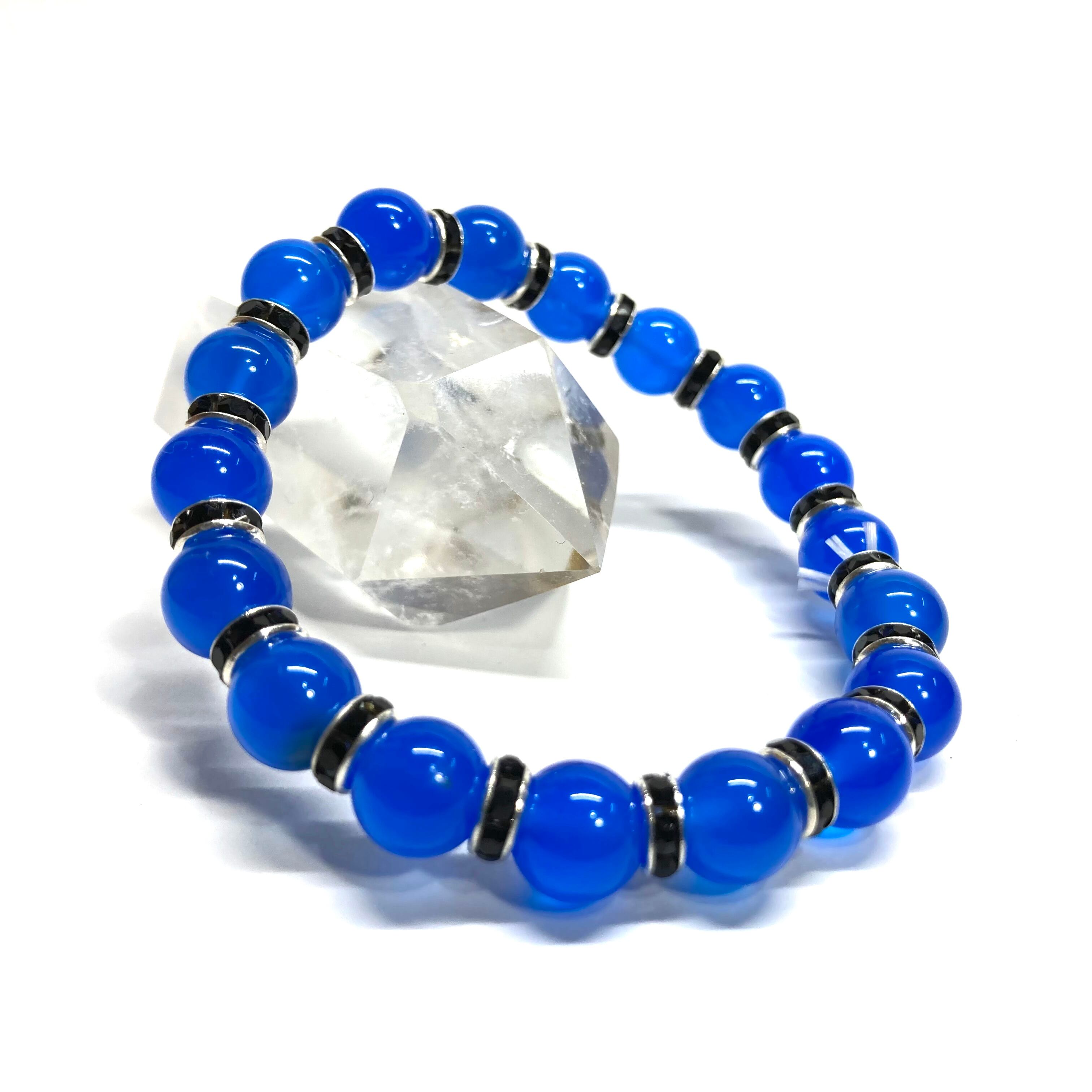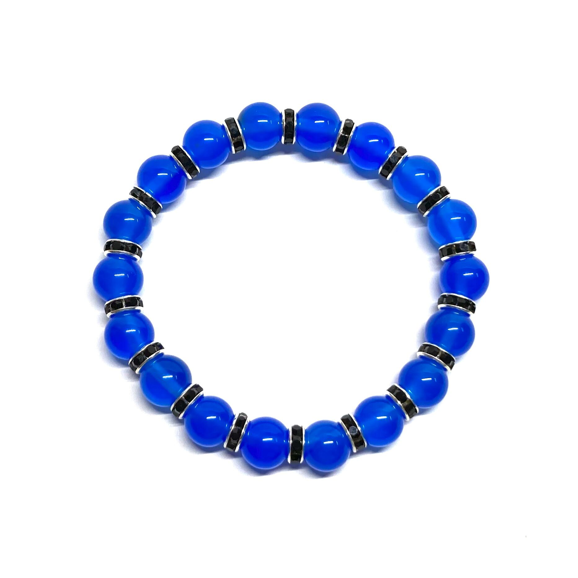 こちらは、ブルーメノウの8mm玉を使用したパワーストーンブレスレットです。石との間にはロンデルを挟み高級感を演出しております。シンプルなデザインは、シーン問わずどんなコーディネートとも合わせ易いブレスレットです。サイズは内周約15cm (手首周りを測り少し余裕をもってお買い求めくださいませ。)です。当社の中でも一番人気の実績があるデザインとなっております。気になる方はお早めにどうぞ。