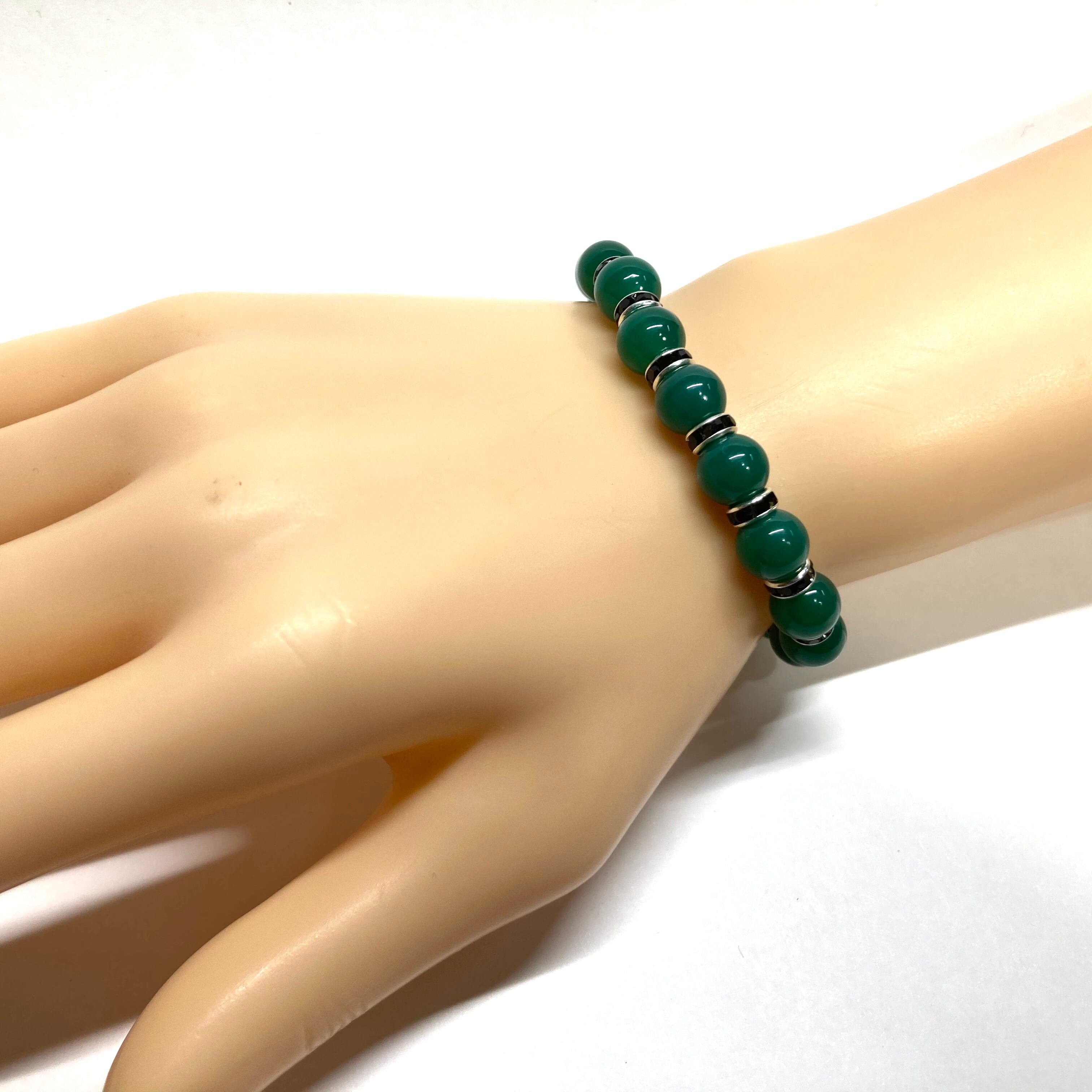 こちらは、緑瑪瑙の8mm玉を使用したパワーストーンブレスレットです。石との間にはロンデルを挟み高級感を演出しております。シンプルなデザインは、シーン問わずどんなコーディネートとも合わせ易いブレスレットです。サイズは内周約15cm (手首周りを測り少し余裕をもってお買い求めくださいませ。)です。当社の中でも一番人気の実績があるデザインとなっております。気になる方はお早めにどうぞ。