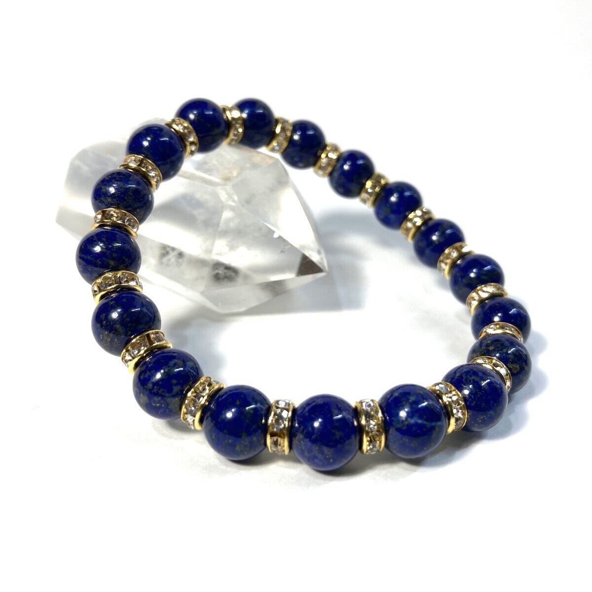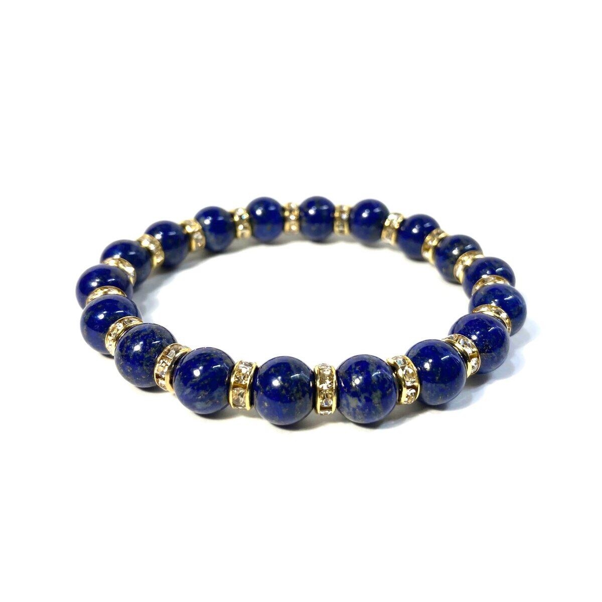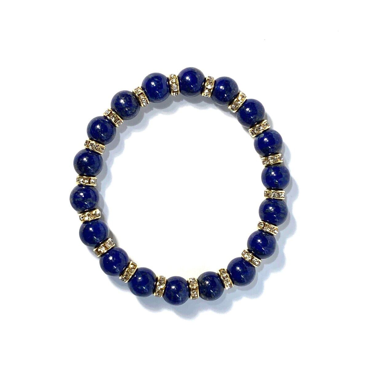 こちらは、ラピスラズリの8mm玉を使用したパワーストーンブレスレットです。石との間にはロンデルを挟み高級感を演出しております。シンプルなデザインは、シーン問わずどんなコーディネートとも合わせ易いブレスレットです。サイズは内周約15cm (手首周りを測り少し余裕をもってお買い求めくださいませ。)です。当社の中でも一番人気の実績があるデザインとなっております。気になる方はお早めにどうぞ。