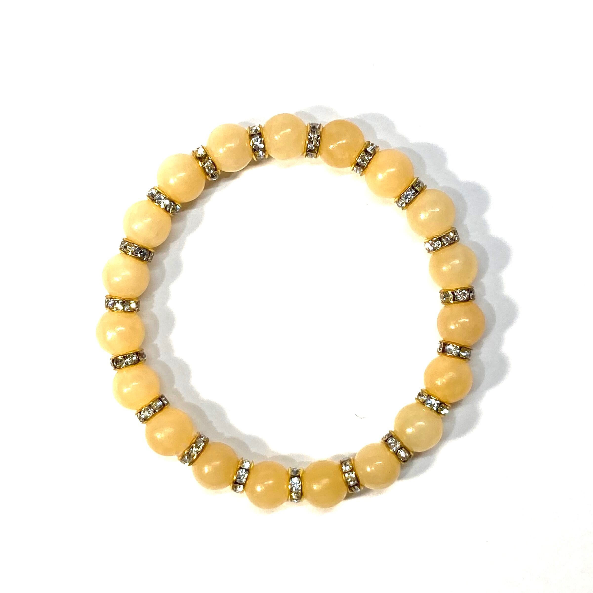 こちらは、アラゴナイトの8mm玉を使用したパワーストーンブレスレットです。石との間にはロンデルを挟み高級感を演出しております。シンプルなデザインは、シーン問わずどんなコーディネートとも合わせ易いブレスレットです。サイズは内周約15cm (手首周りを測り少し余裕をもってお買い求めくださいませ。)です。当社の中でも一番人気の実績があるデザインとなっております。気になる方はお早めにどうぞ。