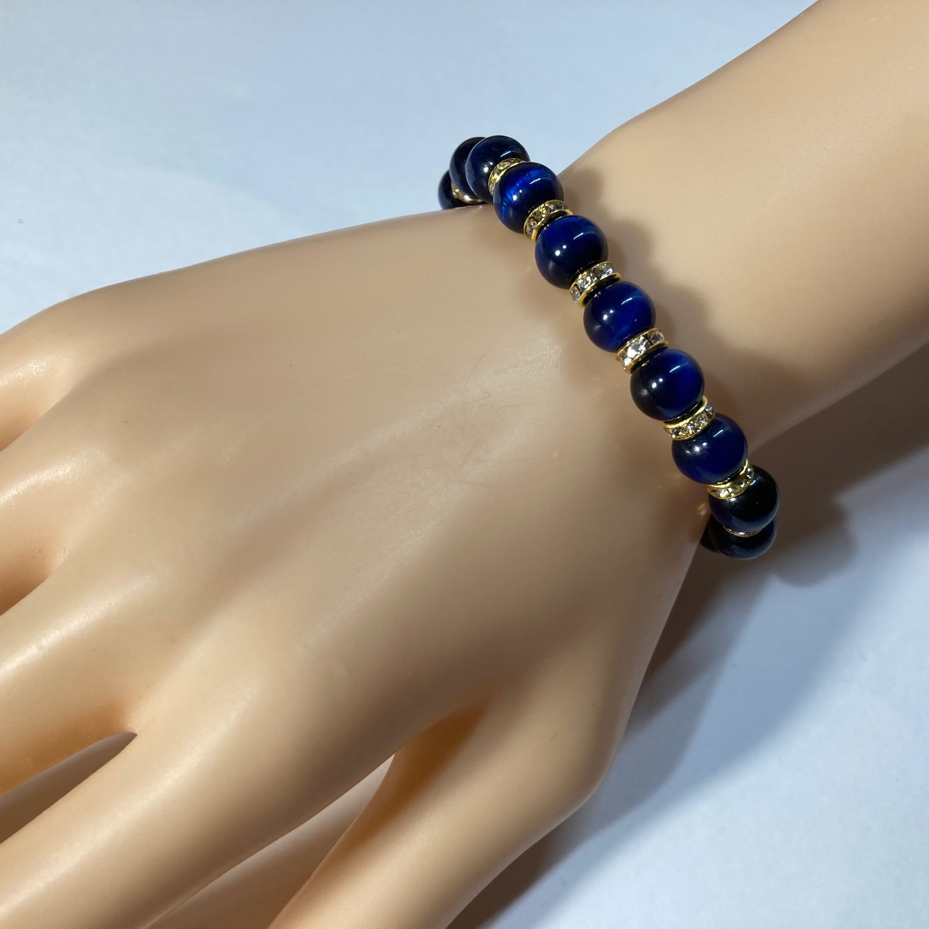 こちらは、ブルータイガーアイ の8mm玉を使用したパワーストーンブレスレットです。石との間にはロンデルを挟み高級感を演出しております。シンプルなデザインは、シーン問わずどんなコーディネートとも合わせ易いブレスレットです。サイズは内周約15cm (手首周りを測り少し余裕をもってお買い求めくださいませ。)です。当社の中でも一番人気の実績があるデザインとなっております。気になる方はお早めにどうぞ。