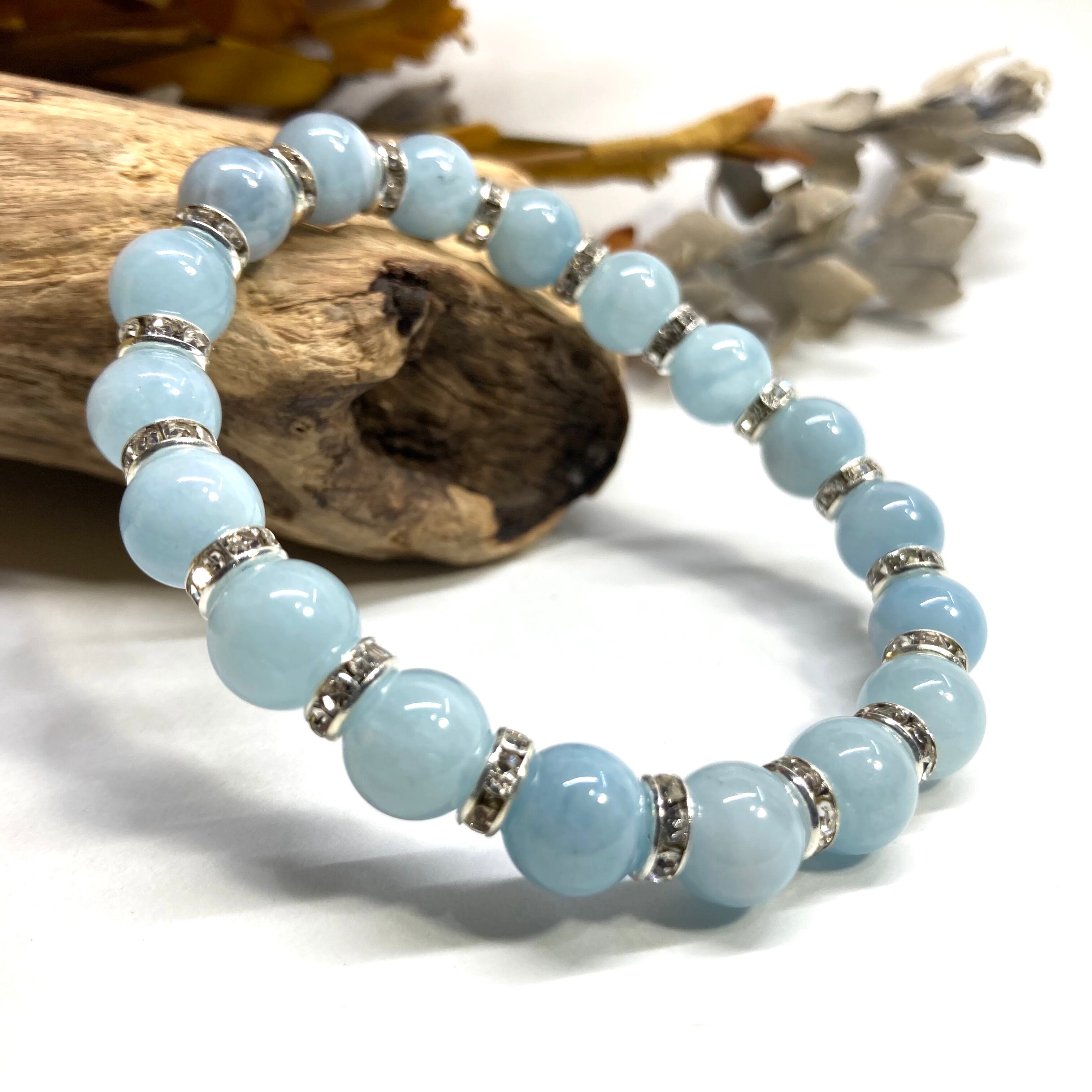 こちらは、アクアマリンの8mm玉を使用したパワーストーンブレスレットです。石との間にはロンデルを挟み高級感を演出しております。シンプルなデザインは、シーン問わずどんなコーディネートとも合わせ易いブレスレットです。サイズは内周約15cm (手首周りを測り少し余裕をもってお買い求めくださいませ。)です。当社の中でも一番人気の実績があるデザインとなっております。気になる方はお早めにどうぞ。