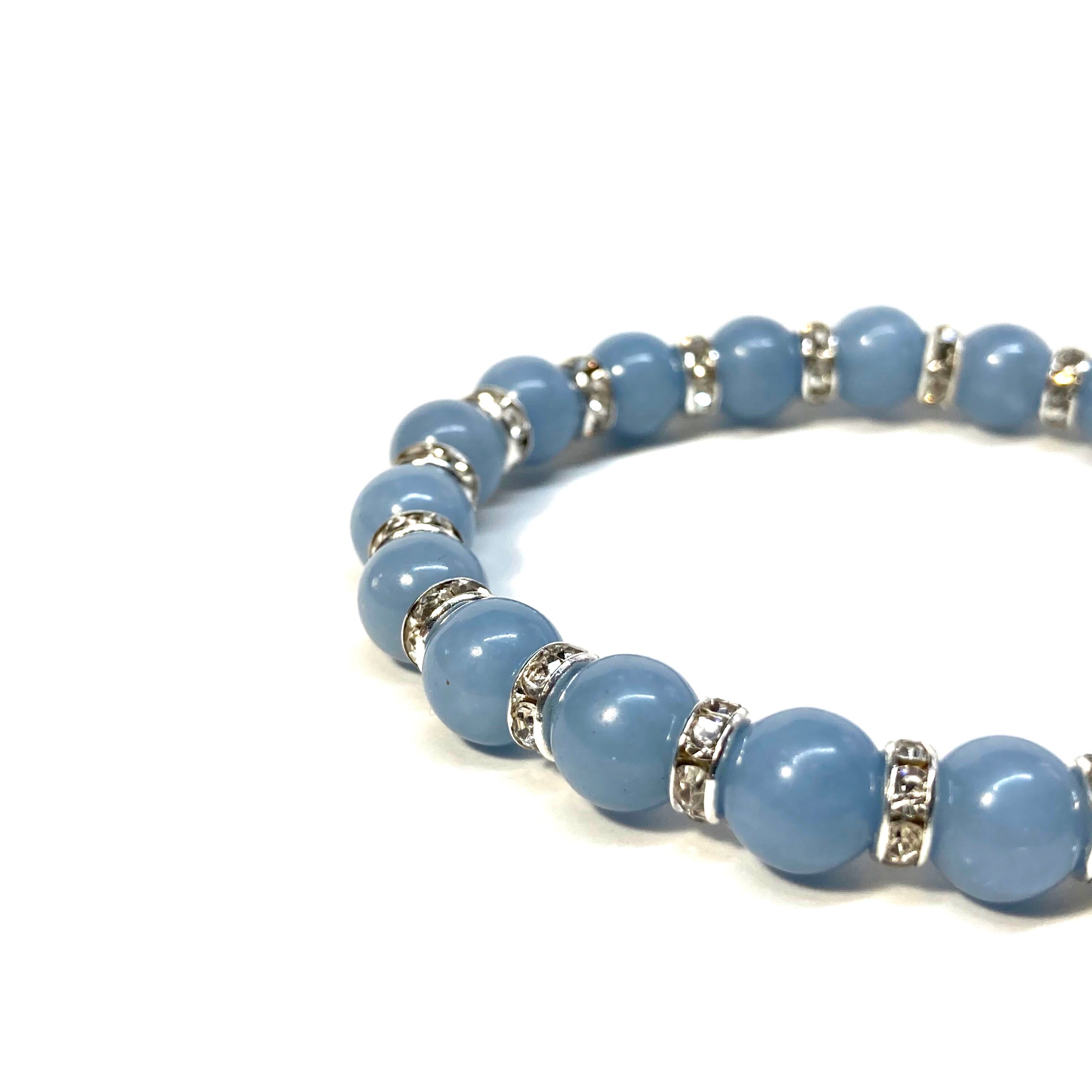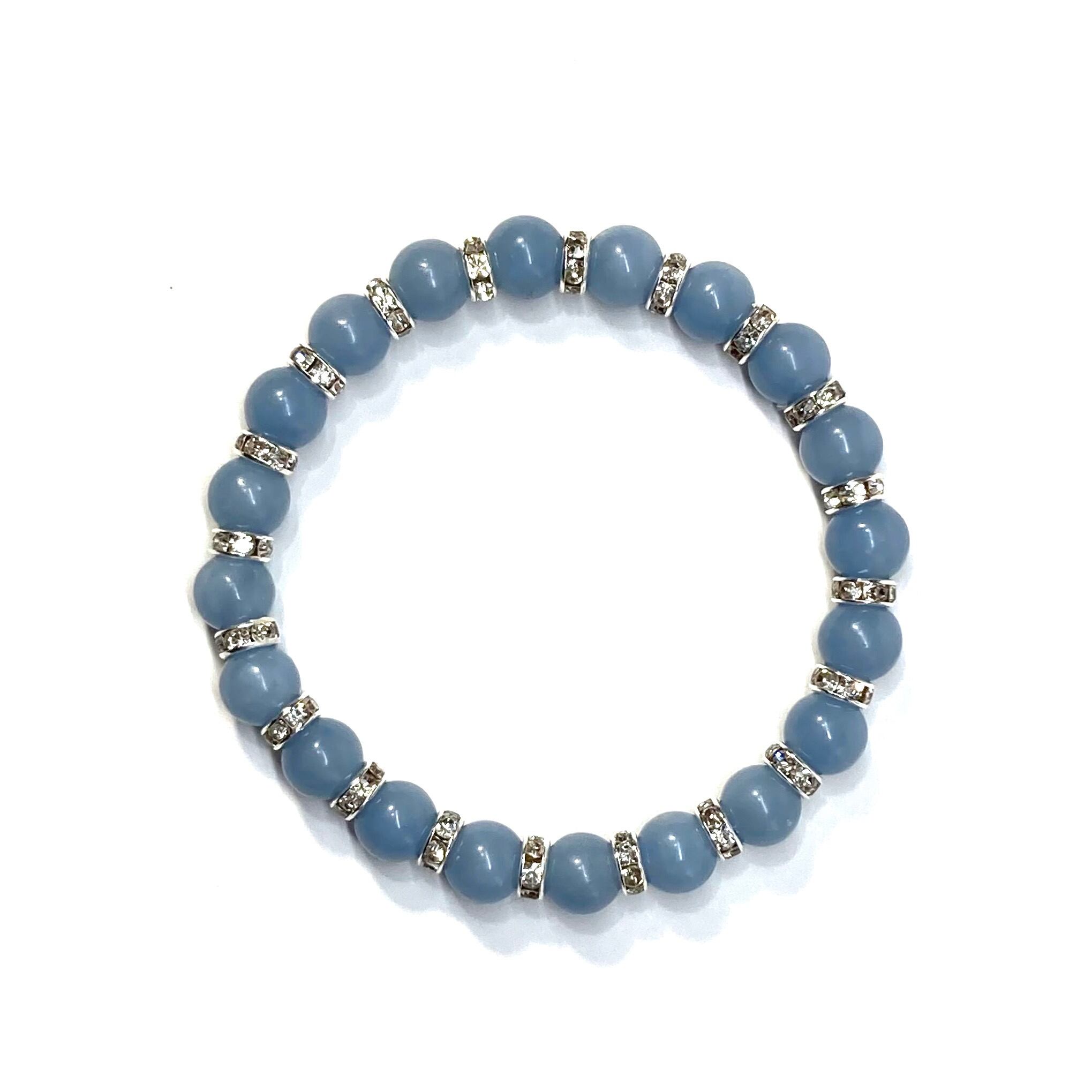 こちらは、エンジェライトの8mm玉を使用したパワーストーンブレスレットです。石との間にはロンデルを挟み高級感を演出しております。シンプルなデザインは、シーン問わずどんなコーディネートとも合わせ易いブレスレットです。サイズは内周約15cm (手首周りを測り少し余裕をもってお買い求めくださいませ。)です。当社の中でも一番人気の実績があるデザインとなっております。気になる方はお早めにどうぞ。