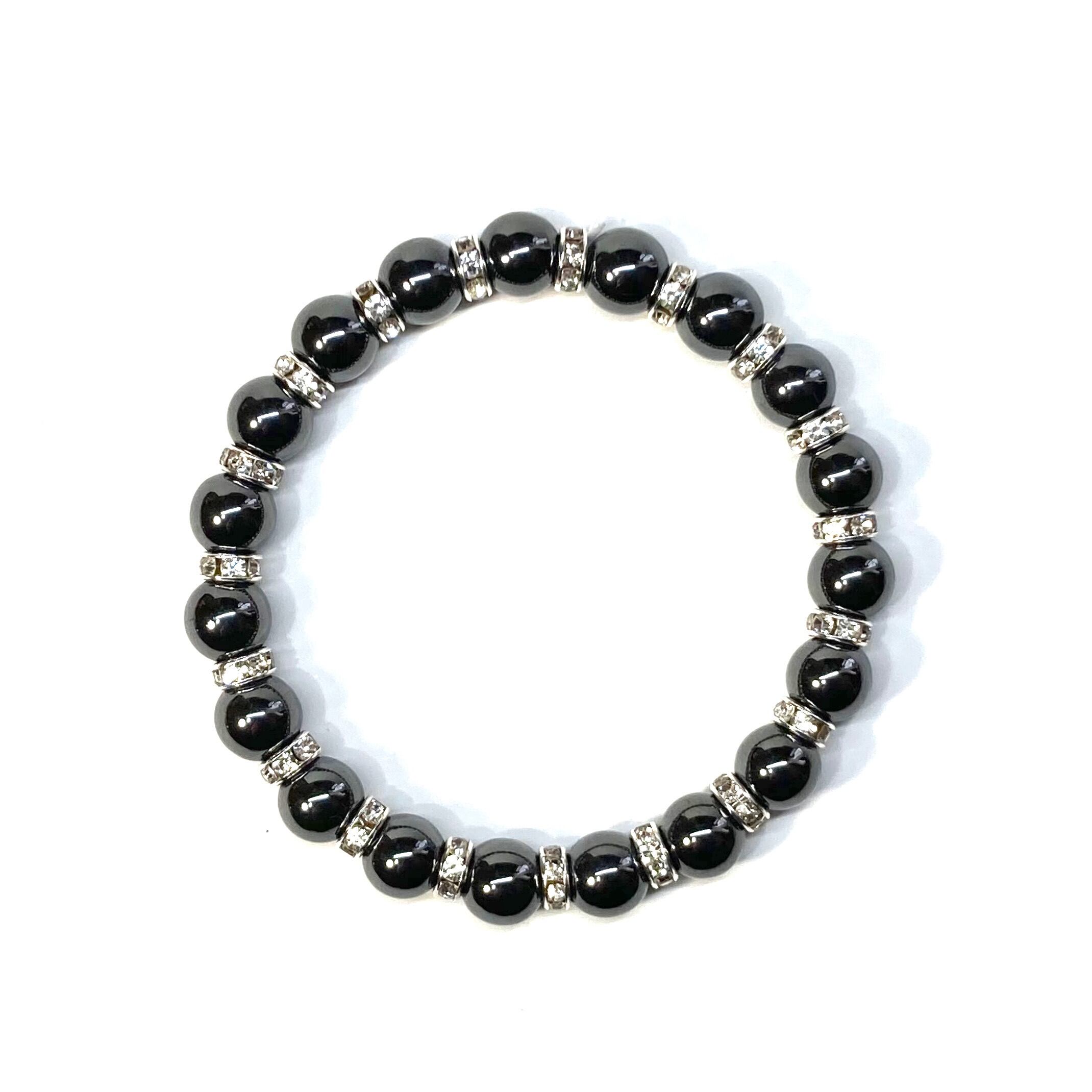 こちらは、ヘマタイトの8mm玉を使用したパワーストーンブレスレットです。石との間にはロンデルを挟み高級感を演出しております。シンプルなデザインは、シーン問わずどんなコーディネートとも合わせ易いブレスレットです。サイズは内周約15cm (手首周りを測り少し余裕をもってお買い求めくださいませ。)です。当社の中でも一番人気の実績があるデザインとなっております。気になる方はお早めにどうぞ。