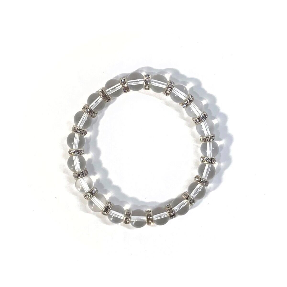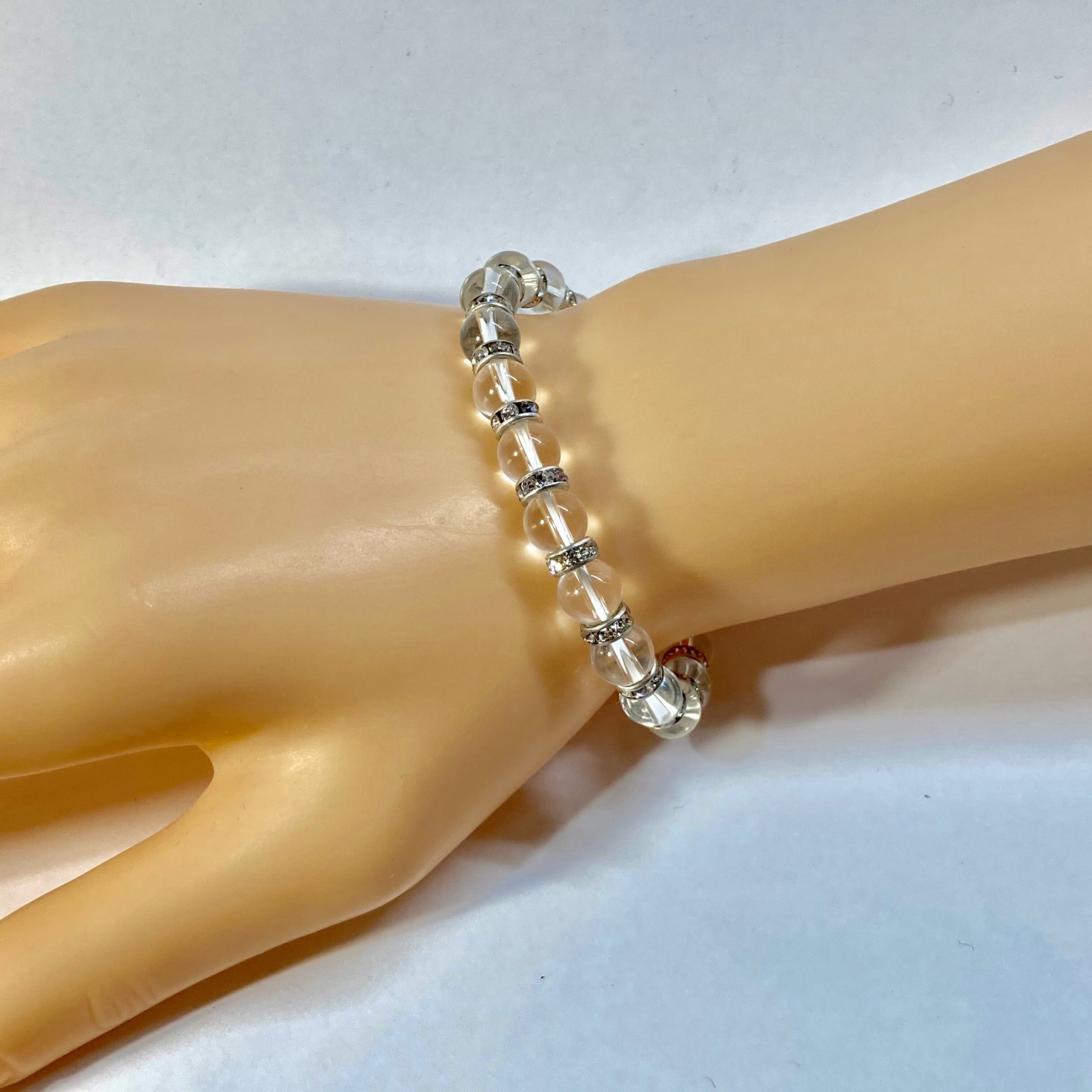 こちらは、水晶の8mm玉を使用したパワーストーンブレスレットです。石との間にはロンデルを挟み高級感を演出しております。シンプルなデザインは、シーン問わずどんなコーディネートとも合わせ易いブレスレットです。サイズは内周約15cm (手首周りを測り少し余裕をもってお買い求めくださいませ。)です。当社の中でも一番人気の実績があるデザインとなっております。気になる方はお早めにどうぞ。