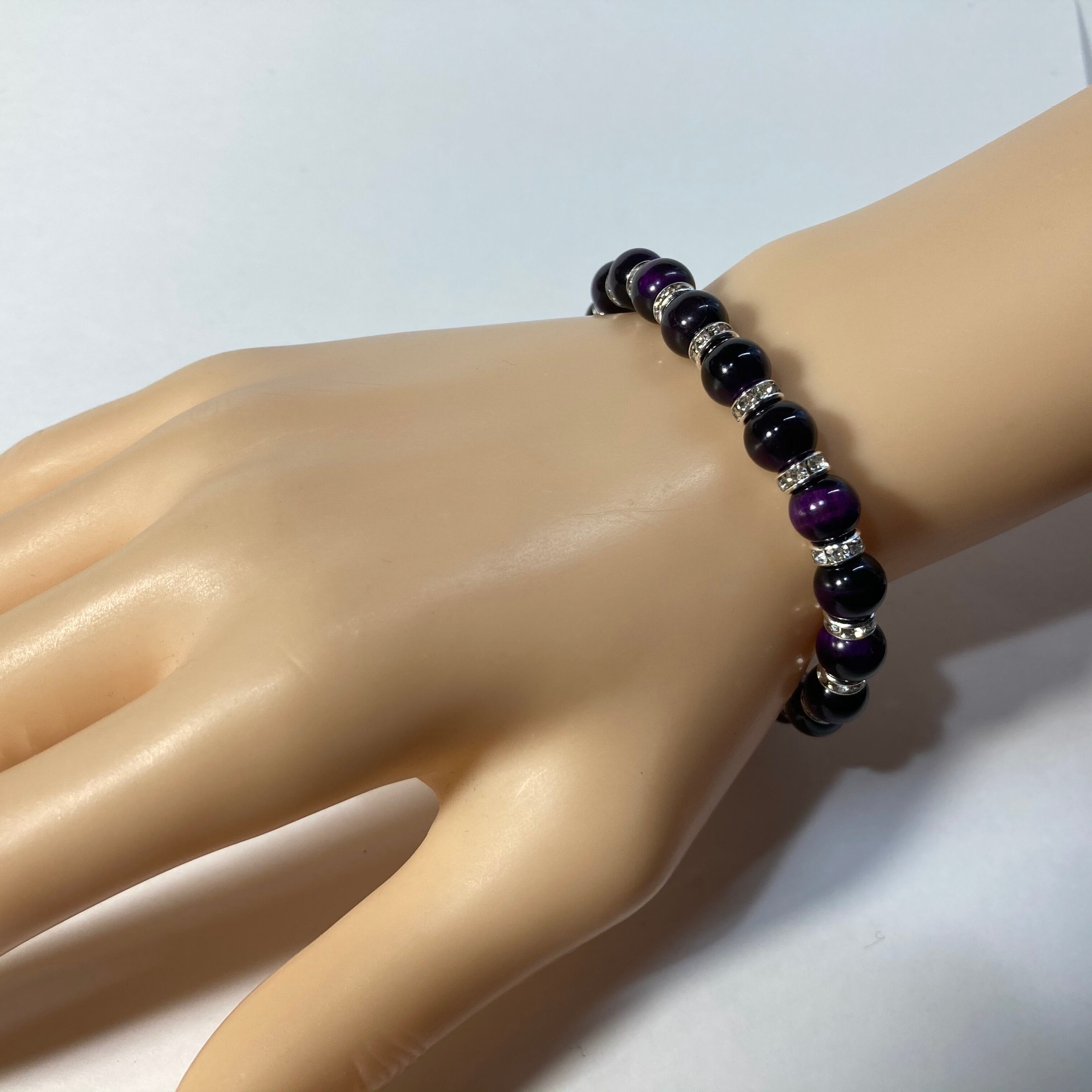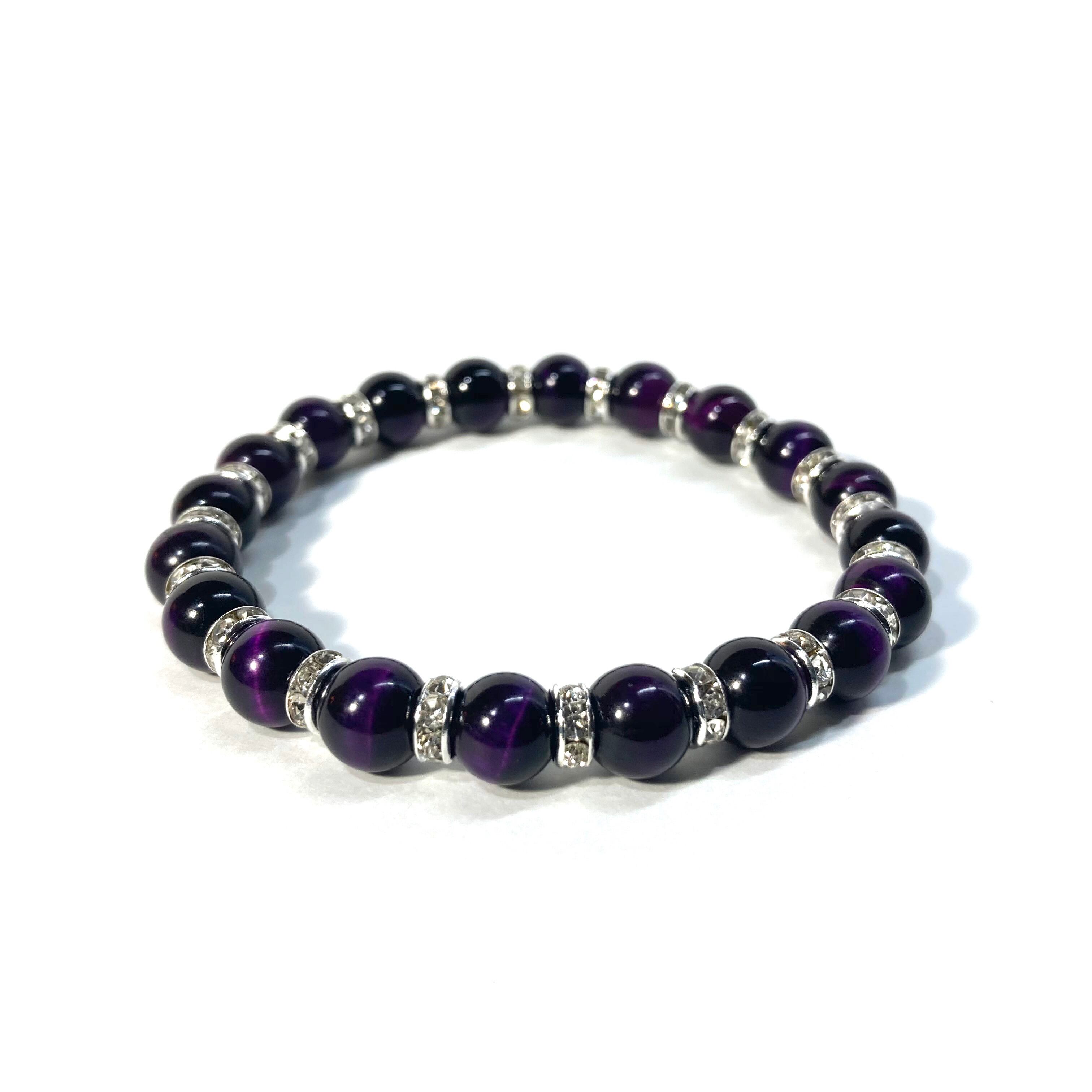 こちらは、パープルタイガーアイの8mm玉を使用したパワーストーンブレスレットです。石との間にはロンデルを挟み高級感を演出しております。シンプルなデザインは、シーン問わずどんなコーディネートとも合わせ易いブレスレットです。サイズは内周約15cm (手首周りを測り少し余裕をもってお買い求めくださいませ。)です。当社の中でも一番人気の実績があるデザインとなっております。気になる方はお早めにどうぞ。