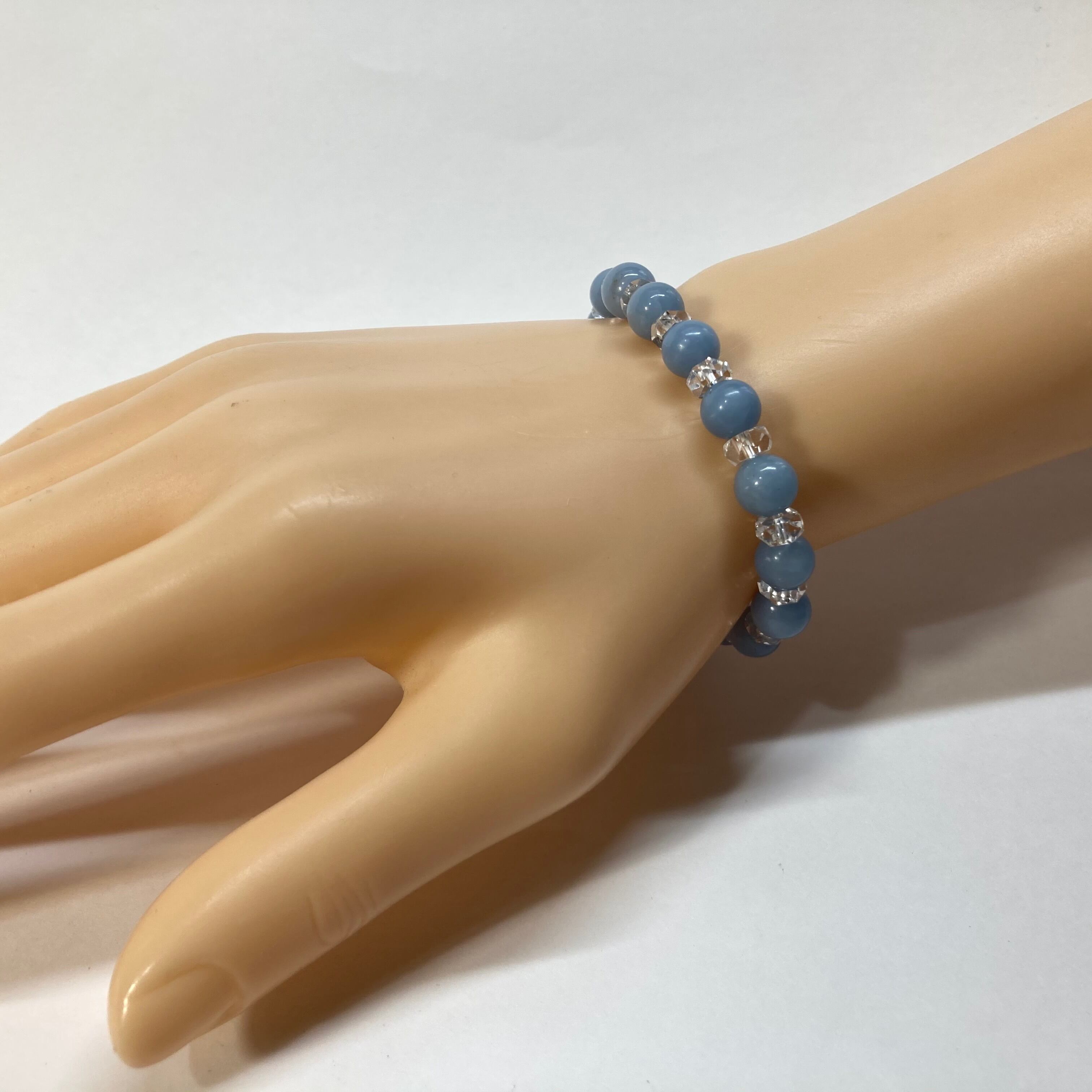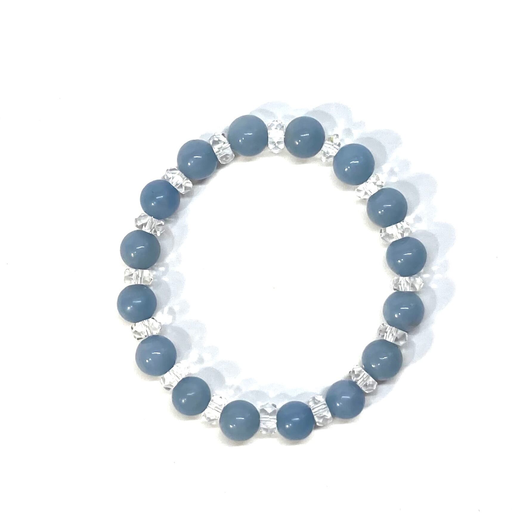 こちらは、エンジェライト の8mm玉を使用したパワーストーンブレスレットです。今回は石との間にキラキラと輝きを見せるカットボタン水晶を使い、いつものブレスレットとはまた違った印象に仕上げています。内周15cmです。(サイズ変更は1cmあたり100円で承っております。サイズ変更の場合は金額変更しますのでメッセージにてご連絡くださいませ。)気になる方はお早めにどうぞ。