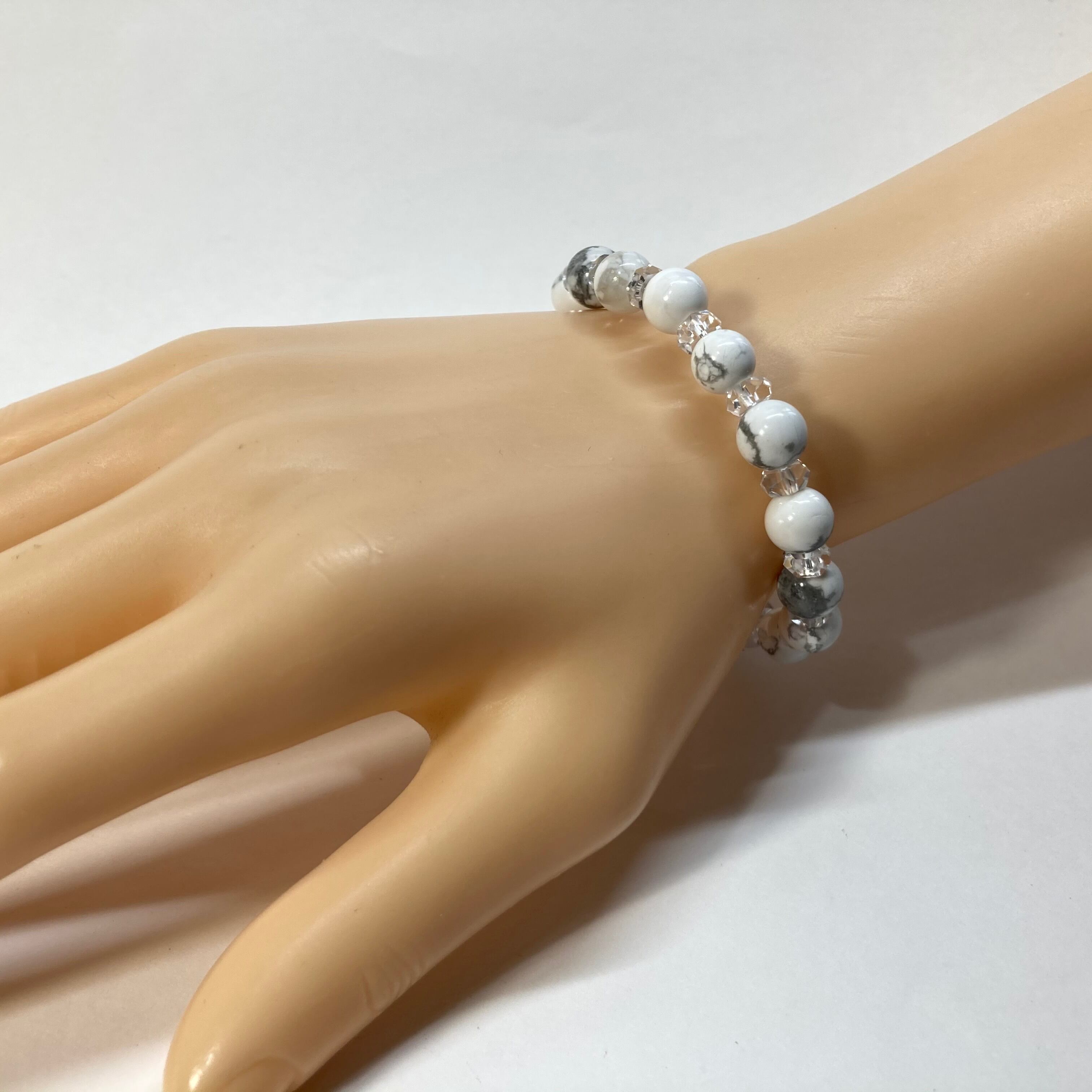 こちらは、ハウライトの8mm玉を使用したパワーストーンブレスレットです。今回は石との間にキラキラと輝きを見せるカットボタン水晶を使い、いつものブレスレットとはまた違った印象に仕上げています。内周15cmです。(サイズ変更は1cmあたり100円で承っております。サイズ変更の場合は金額変更しますのでメッセージにてご連絡くださいませ。)気になる方はお早めにどうぞ。