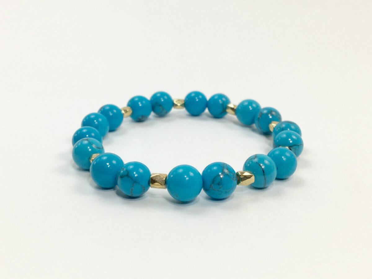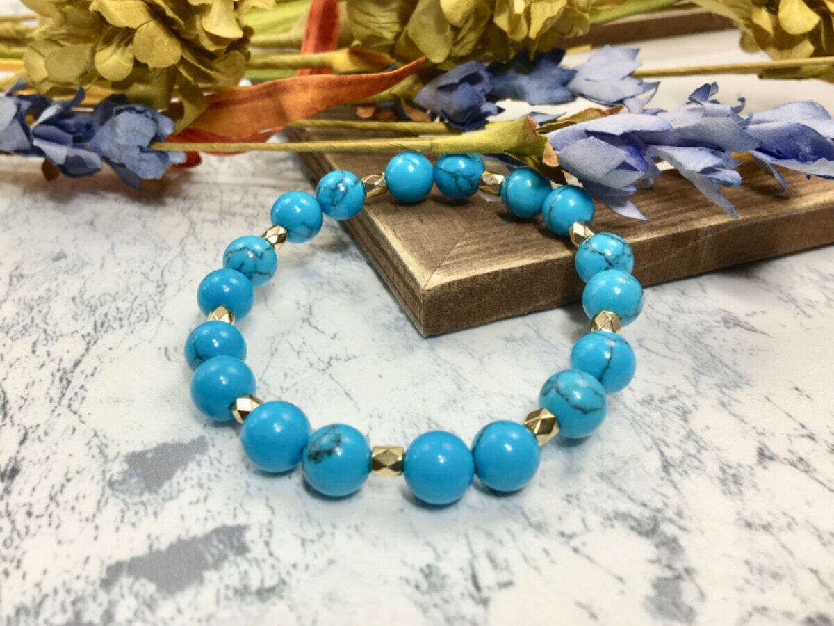 こちらのブレスレットは、ターコイズを使用したブレスレットです。石との間に多面体のゴールドのパーツを挟み上品な印象を演出しております。シンプルなデザインでどんなコーディネートにも合わせやすいデザインです。石大きさは腕にも馴染みやすいように8mm玉を使用、内周 約15cm(伸可能)です。気になる方は是非この機会にどうぞ。