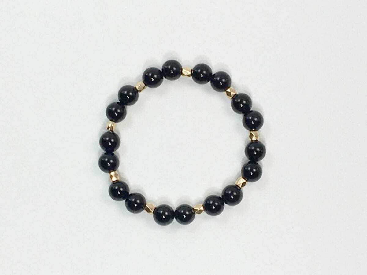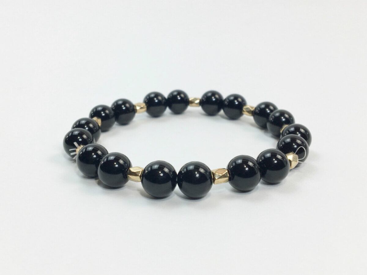 こちらのブレスレットは、ブラックオニキスを使用したブレスレットです。石との間に多面体のゴールドのパーツを挟み上品な印象を演出しております。シンプルなデザインでどんなコーディネートにも合わせやすいデザインです。石大きさは腕にも馴染みやすいように8mm玉を使用、内周 約15cm(伸可能)です。気になる方は是非この機会にどうぞ。