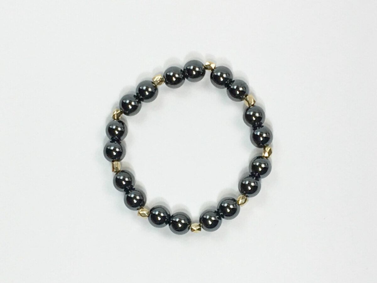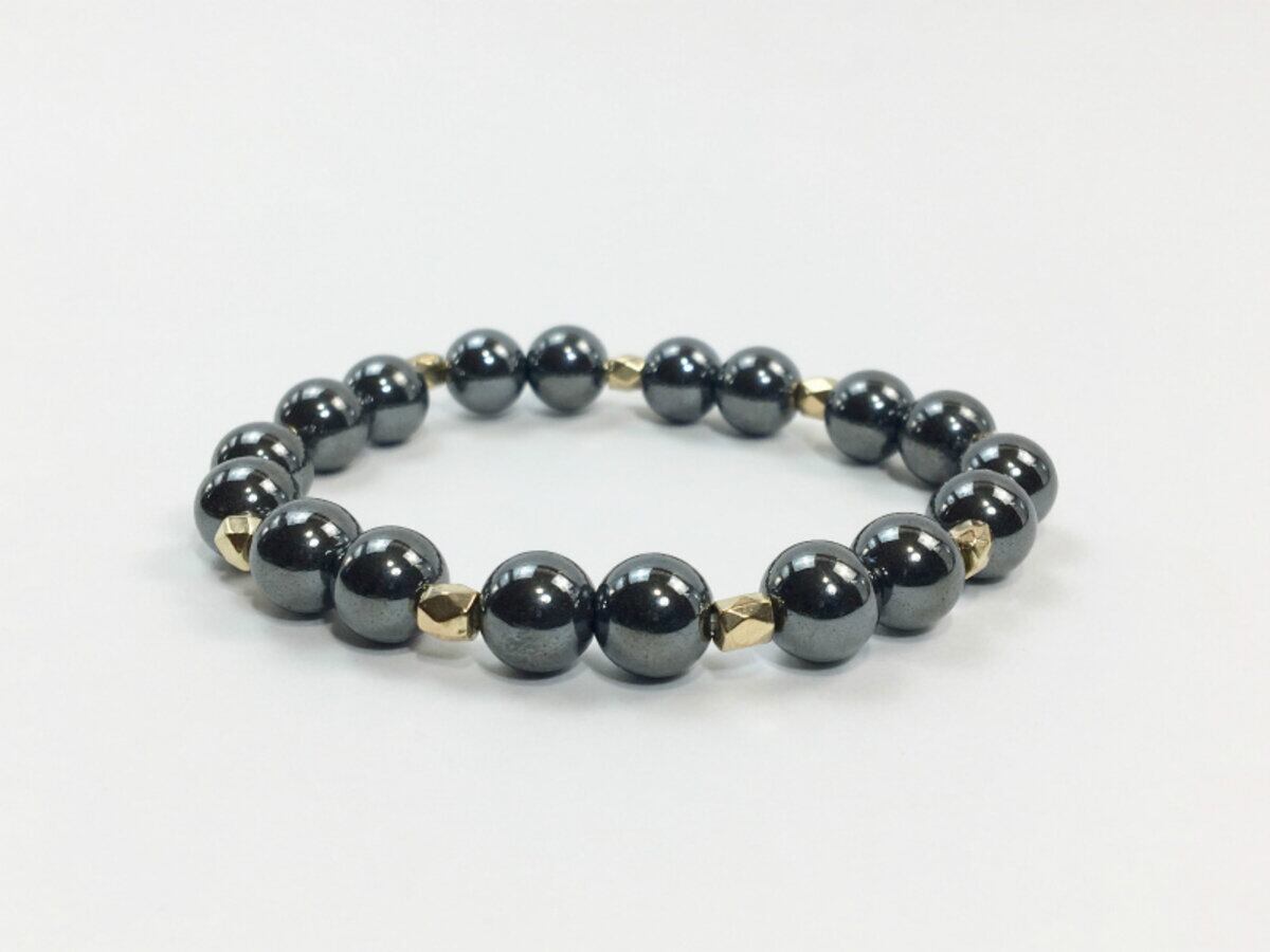 こちらのブレスレットは、ヘマタイトを使用したブレスレットです。石との間に多面体のゴールドのパーツを挟み上品な印象を演出しております。シンプルなデザインでどんなコーディネートにも合わせやすいデザインです。石大きさは腕にも馴染みやすいように8mm玉を使用、内周 約15cm(伸可能)です。気になる方は是非この機会にどうぞ。