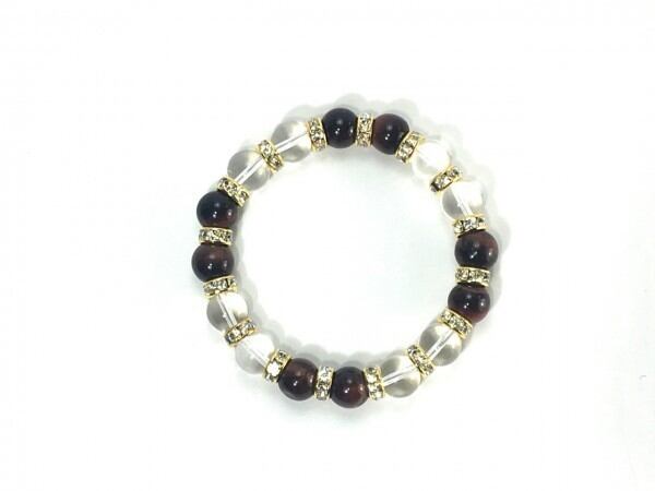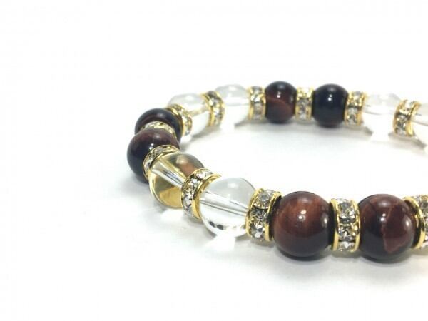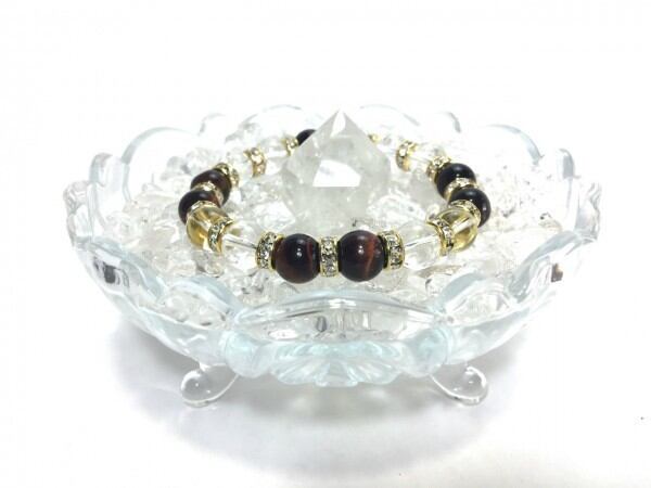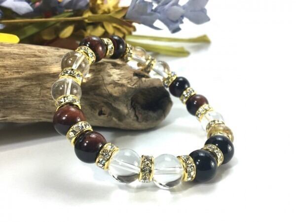 こちらは、レッドタイガーアイと水晶を組み合わせたブレスレットです。間にはロンデルを挟み高級感あるデザインに仕上がっています。石大きさは腕にも馴染みやすいように10mm玉で内周約16cm(伸可能)です。数に限りがございますので気になる方はお早めにどうぞ。